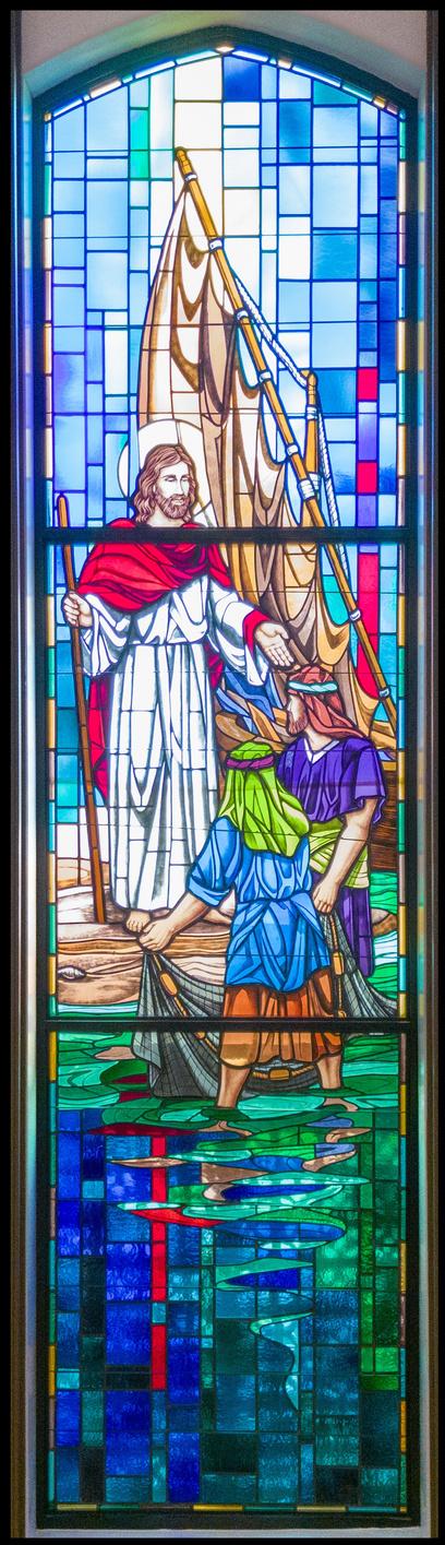 This window commemorates the calling of Simon (Peter) and Andrew, to follow Jesus and be his disciples. “Follow me and I will make you fish for people.” Behind Jesus in the window, we can see the sails from their boat. Simon and Andrew stand in the water at the shore of the Sea of Galilee, holding their empty fishing nets. The fishing practices of the day involved casting nets, and in the biblical accounts, the disciples are never successful in their fishing unless Jesus makes them successful. Jesus stands on the shore, speaking to the two. Here, he still wears white, but a red cloak has been added to his attire. Red is the color symbolic of blood sacrifice. Not only will Jesus offer his own blood in sacrifice, but most of his disciples will ultimately suffer martyrdom as well.