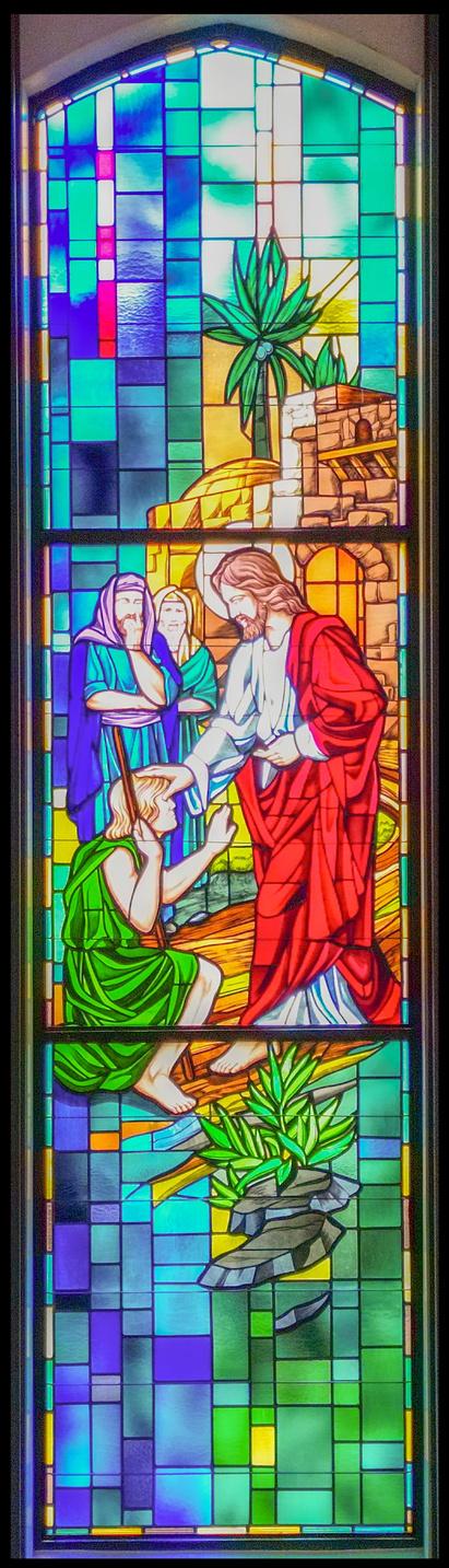 Jesus healed many people from different afflictions in the gospels. Mark’s Gospel tells us Jesus healed a blind man outside of Bethsaida (north end of the Sea of Galilee), Mark and Luke include an account of Jesus healing a blind man outside of Jericho (further south), and John tells us of a blind man outside the Temple in Jerusalem, whom Jesus healed. In our window, he restores sight to a blind man, who kneels before Jesus and reaches out for him. Jesus has a hand on the man ’ s head, with his thumb touching the man ’ s eye. Behind them stand two men: one has his arms crossed and his eyes closed, and the other has his eyes wide open and his mouth agape. Could they be the “divided” Pharisees in John’s account? The window includes some architectural detail of buildings in the background, as well as indication that Jesus and the blind man are on a road. There are palm trees in the background and possibly additional palm fronds towards the bottom of the window. Palm fronds were symbolic of victory, and the healing episodes in the gospels show Jesus’ victory and power over ailments of all kind.