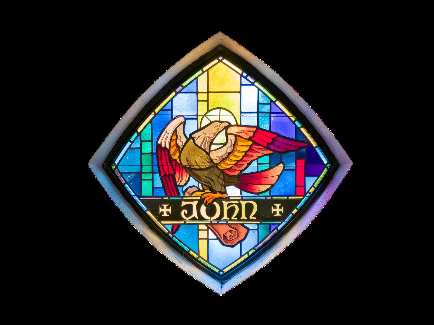 The symbol for the author of the fourth gospel is an eagle. Eagles were thought to fly higher than other birds and even to be able to look directly into the sun. John’s writing is lofty and visionary in style. He tells the story of Jesus, but his interest is in revealing the theology behind his words and the happenings in his life. The eagle in the window holds a scroll, representing the written works of John.