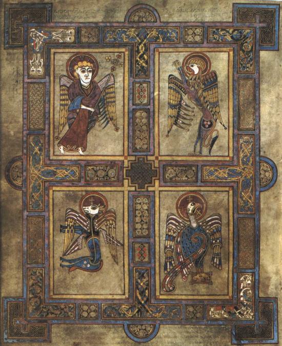 Written in Latin, it is believed to have been created by Celtic monks in a Columban monastery on the Isle of Iona in Scotland. In the picture to the left, you can see an illumination from the book, depicting the four evangelists as winged man, winged lion, eagle, and winged ox.