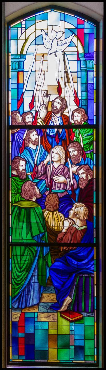 In The Acts of the Apostles, we read about the day of Pentecost, fifty days after the resurrection of Christ. When the apostles were gathered, the Holy Spirit came upon them with the sound of a great rushing wind and tongues of flame. Thus empowered, they began speaking and preaching in many languages. In our stained-glass window, we can see the Holy Spirit, represented by the dove and the red tongues of flame over each apostle’s head. Counting them, we note there are twelve apostles present. Judas Iscariot, who had betrayed Jesus, is no longer numbered among them, but rather Matthias, who had been selected as his replacement, is present for this event. In the designing of this window, the artist originally pictured the apostles with graying and white hair, but our School’s founding bishop, Bishop Benitez, asked the artist to change their hair color to a more youthful shade, which would make them more identifiable for our high school population. At the bottom of the window, we can see an anachronistic red book, perhaps reminding our students to be apostles, too, sharing the Good News of the resurrection.