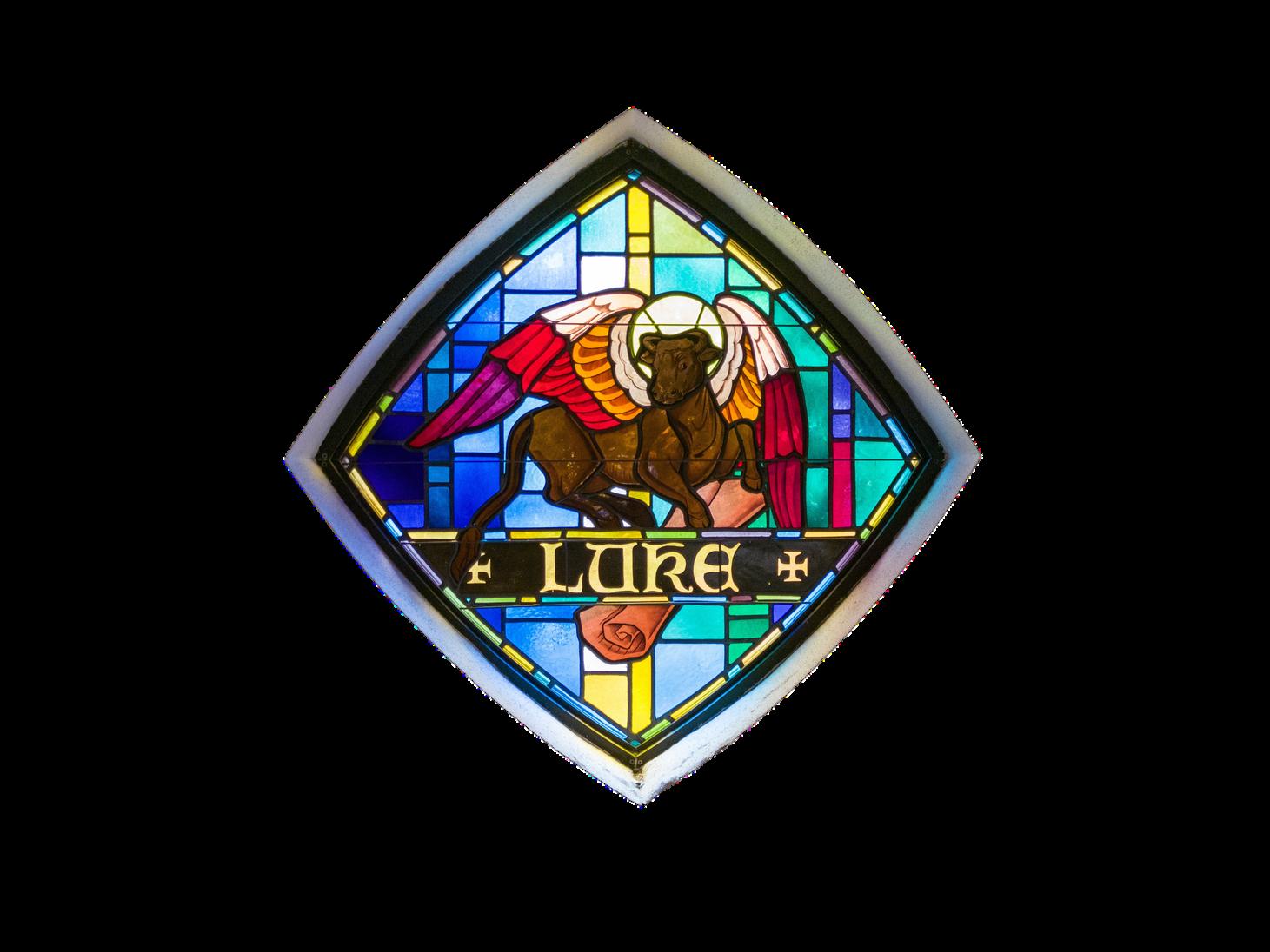 The symbol for Luke is the winged ox. The ox was a sacrificial animal in ancient Judaism, and Luke’s gospel emphasizes the sacrificial nature of Jesus’ life and death. In the window, the ox holds a scroll, representing the written works of Luke.