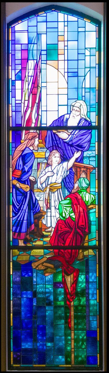 This window was given to the Glory of God in Honor of William Stamps Farish and Sarah Sharp Farish Luke 2:41-51 provides readers with the only story from Jesus’ youth. When he was twelve years old, and he and his parents went to Jerusalem for Passover, he stayed behind when their group left to return home. His parents returned anxiously to Jerusalem to find him. He was in the Temple, sitting among the teachers, listening, asking questions, and amazing them with his understanding. At the top of the window can be seen some arches and a red marbled pillar, nods to the Temple setting. The young Jesus stands with a hand raised in teaching. He is surrounded by three teachers, who are positioned to listen to Jesus. Two of the teachers hold scrolls, and the seated teacher has both a scroll and a book at his feet. Scrolls would have been used in Jesus’ day, but the book is a tip of the hat to our students and school setting today.