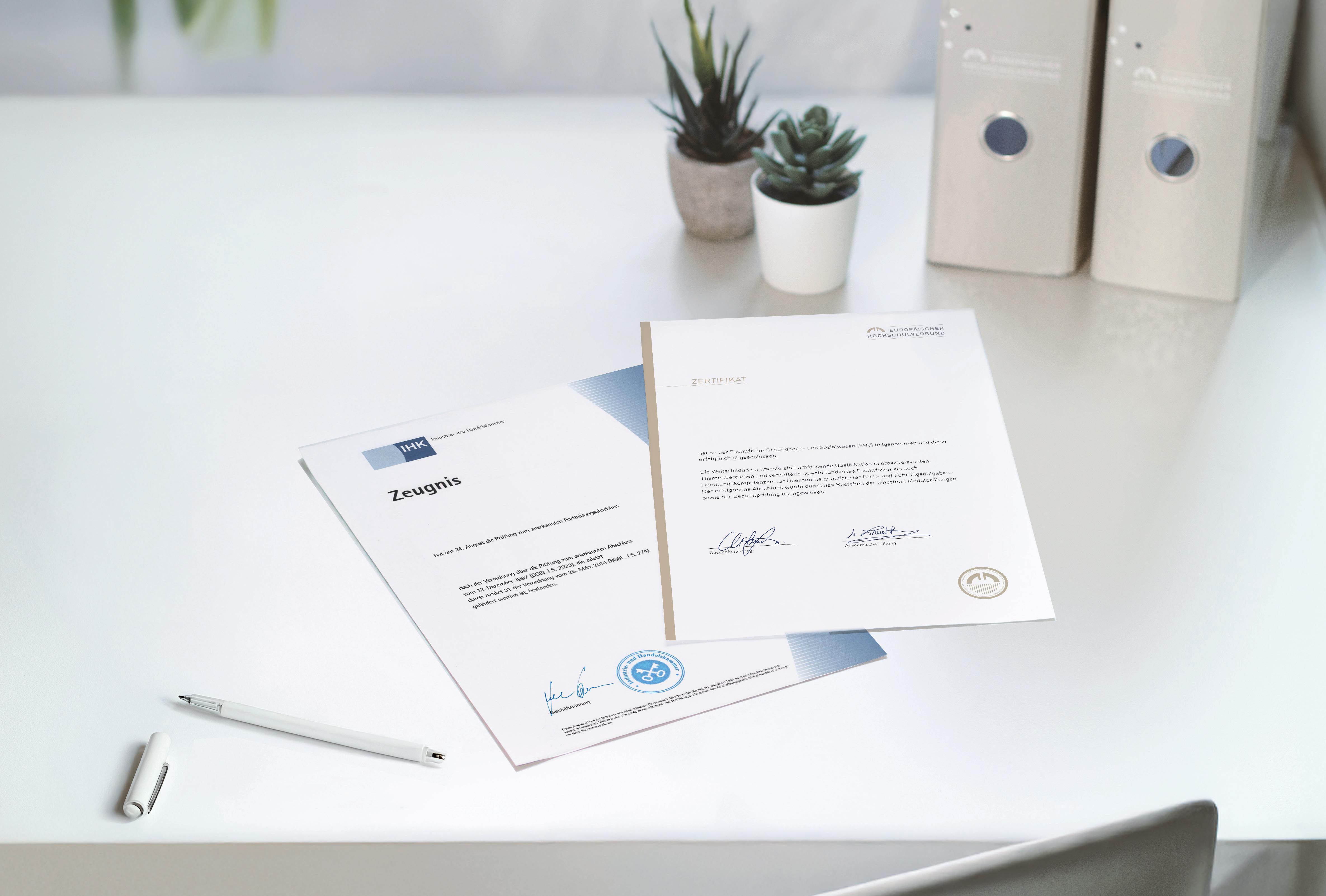 Unsere Aufstiegsfortbildung schließt mit der anerkannten IHK-Abschlussprüfung ab. Hierfür meldest Du Dich selbständig bei Deiner IHK vor Ort an. Zusätzlich bieten wir eine institutseigene Prüfung an, die mit einem EHV-Abschlusszeugnis und Zertifikat abschließt. Du entscheidest selbst, ob Du diesen Abschluss machen möchtest. Beide Prüfungen dokumentieren Deine praktischen und theoretischen Kenntnisse, stärken Deine Qualifikation und eröffnen neue Karrierechancen.