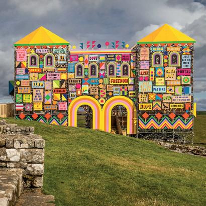 Visitors to Housesteads Roman Fort on Hadrian’s Wall may have been taken by surprise on approach to the site this summer. On the brow of the hill, the remains of the original north gatehouse are usually noted for their rugged, aged stonework, connecting the modern visitor to this once-thriving military site, and the bleak and beautiful landscape that was the final northern frontier of the Roman Empire. Now commemorating 1,900 years since the building of the wall, with its many forts and towers, by the Emperor Hadrian, the Housesteads site marked the occasion with a vast and colourful temporary art installation. The artwork entitled The future belongs to what was as much as what is was created by artist Morag Myerscough, poet Ellen Moran and the local community. In place from late July to