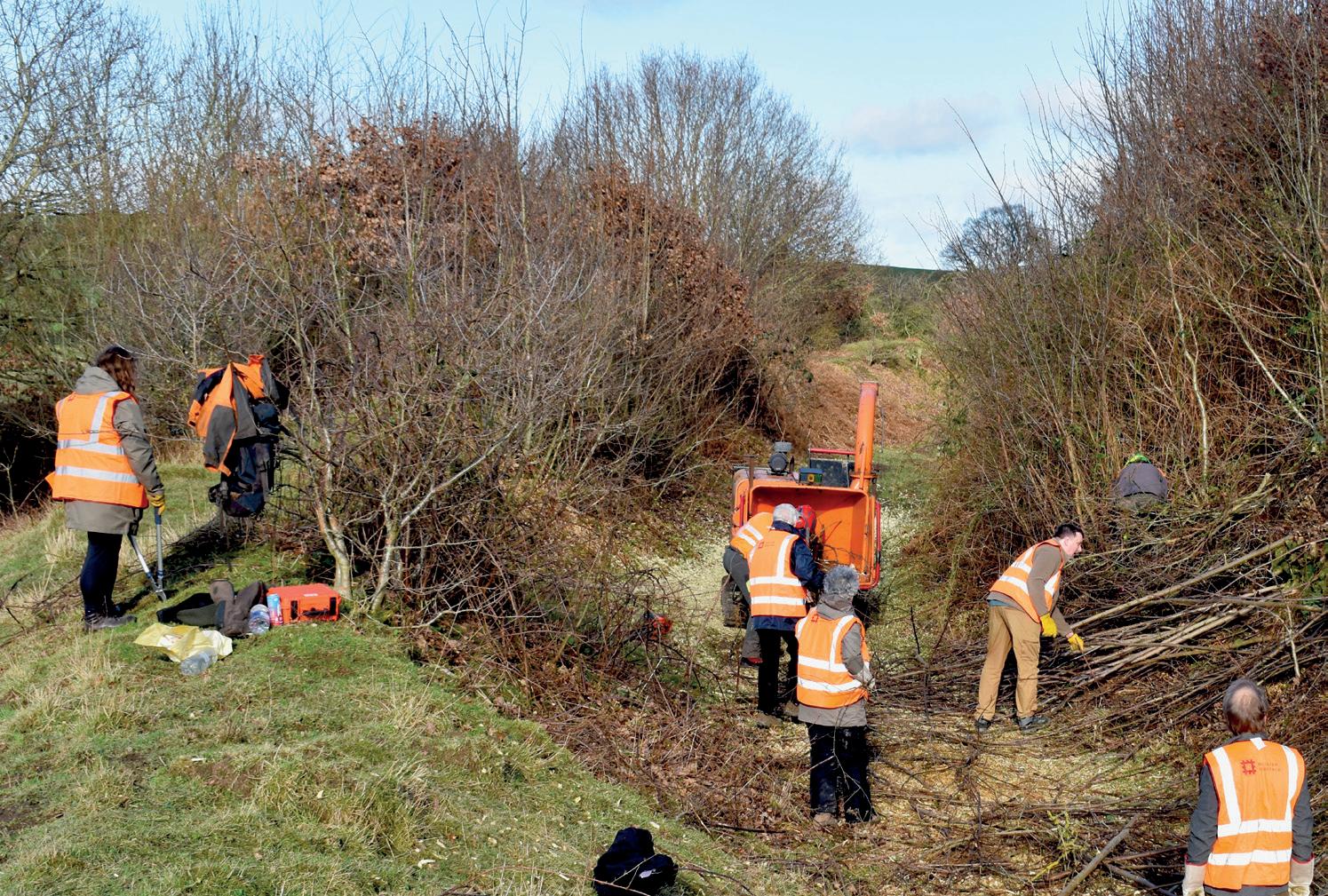 gorse, broom, thorn, bramble and oak saplings. It’s possible that the ponds contain undiscovered organic archaeological remains, so it was important to clear them. Ecologists supported the volunteers as they removed willow and other weeds that had accumulated in the ponds. We can’t use machines for this work as the environment is too fragile and risk harming the newts and other pond life so the team wrapped up in warm clothing and waders to complete the tasks by hand. Elsewhere, volunteers cut back scrub over very steep slopes and dragged the cuttings to a chipper. The wood bark was then sprayed over the ditches, forming a protective surface for visitors to walk on.