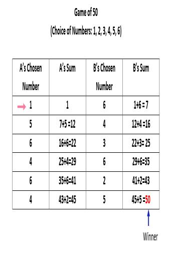 Two players (let's say A & B) can compete as rivals in this game. They can select any of the numbers 1, 2, 3, 4, 5, and 6 that are presented to them. The game can be started by any player. Let's imagine that A choose "1" to begin, after which the turn passes to B. Let's say B choose 6. When B's sum equals 7 (1 plus 6) the turn passes to A. If, for example, A selects "5", A's sum equals 12 (=7 + 5), and the turn passes to B. The selection of numbers is kept going till the total is 50. The winner is the person whose total reaches 50 first.