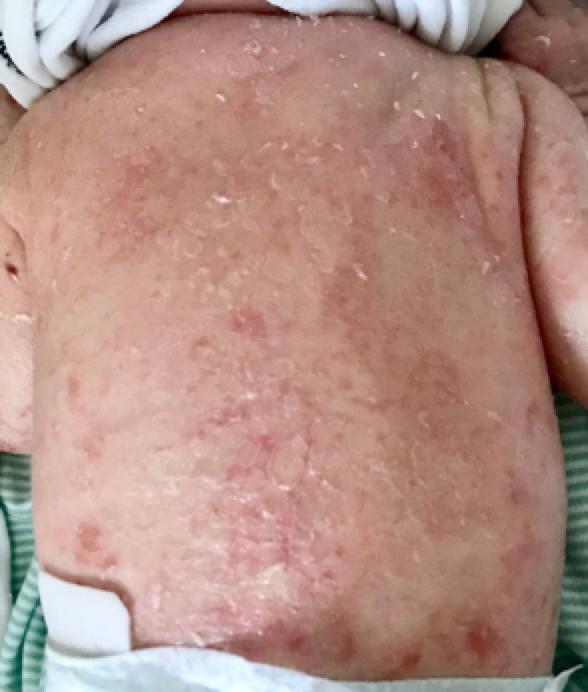 Sloughing skin on inner arm and very dry scale in elbow crease.