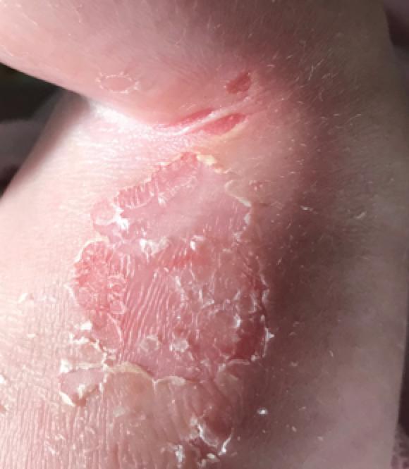Posterior thigh showing healing blister and cracking of ridges in knee crease