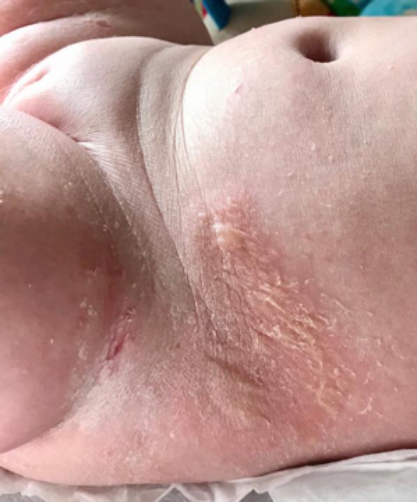 Widespread skin sloughing in armpit crease, and along length of arm.