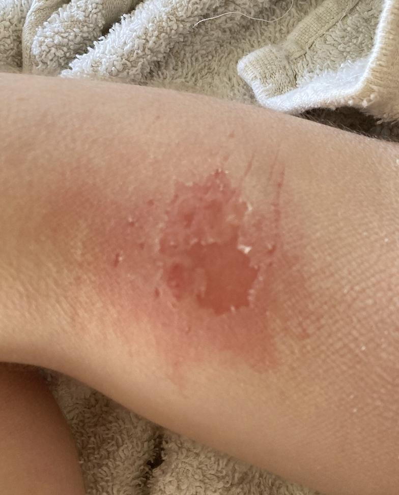 Left arm image indicating scale at elbow crease, widespread sloughing, and blisters