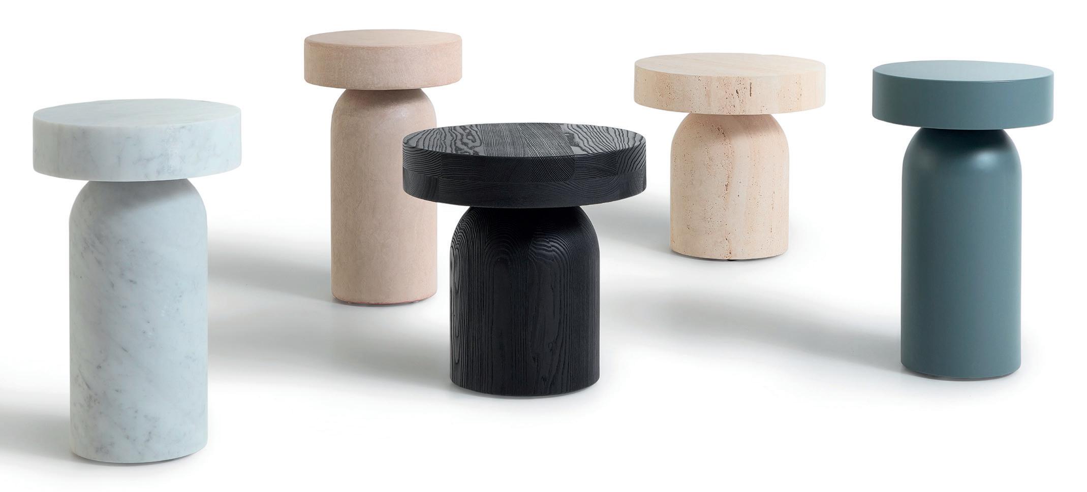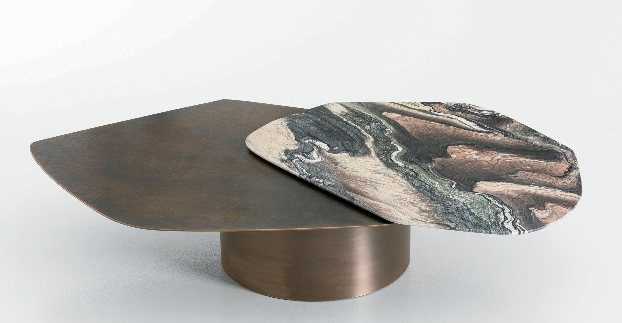 Pratici e poliedrici, leggeri e raffinati. Tavolini, con tagli e altezze diversi, accomunati da un raffinato gioco di incastri e sovrapposizioni. Tavolini oggetti-gioiello lavorati con dettagli e materiali importanti - legno, pelle e marmo - progettati con una semplicità visiva e costruttiva assoluta, nel modo più naturale che ha un artigiano di mettere insieme assi di legno o plasmare forme tonde.