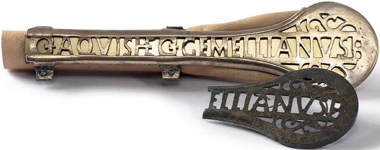 Chiave del rilancio delle terme di Baden, la nuova struttura Fortyseven°, ideata da Mario Botta riconnettendo il centro abitato con il fiume e il complesso termale con il paesaggio, valorizzando l’energia del luogo. Sotto, un portacoltelli del bronzista romano Gemellianus, che reca inciso il nome di Aquae Helveticae, appellativo originario di Baden: ne sono stati ritrovati anche in Gran Bretagna e sull’Eufrate a dimostrazione della sua fama.