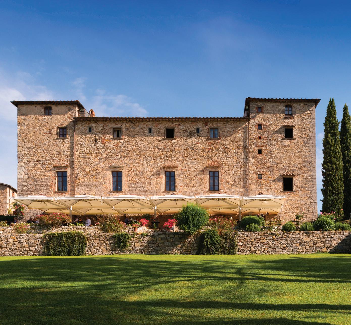 Sopra, nelle suite del Castello di Spaltenna, con vista sulla campagna toscana, ogni dettaglio ha il sapore della storia.