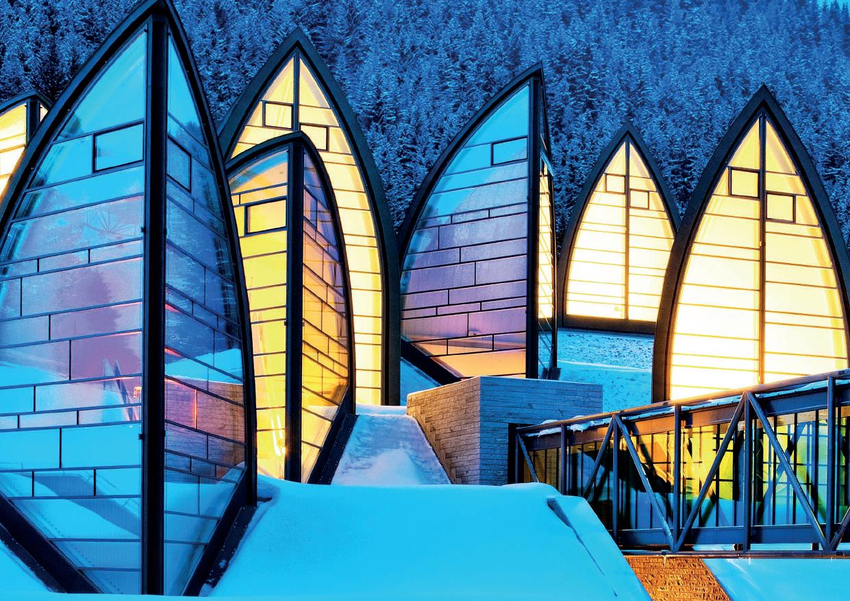 Fra le strutture firmate da grandi architetti, un gioiellino sono le terme di Vals: il verde delle 60mila lastre di quarzite locale impiegate si fonde con i riflessi dell’acqua e i giochi di luce naturale, trasformando le 7132 Therme in un mistico luogo di pace, tra i più rappresentativi dell’architetto svizzero Peter Zumthor. Appartiene sempre alla categoria degli Spa hotel design un’altra creazione del ticinese Mario Botta, il Tschuggen Bergoase, punto di riferimento del Grand Hotel Tschuggen e di Arosa. Incastonate sulle pendici della montagna tra cielo e terra, le sue vele filigranate di vetro e acciaio inondano i quattro piani di luce e prospettive panoramiche. Leggerezza, comfort, lusso non ostentato e design armonioso si fondono con l’aura della pietra e dell’acqua invitando al relax.