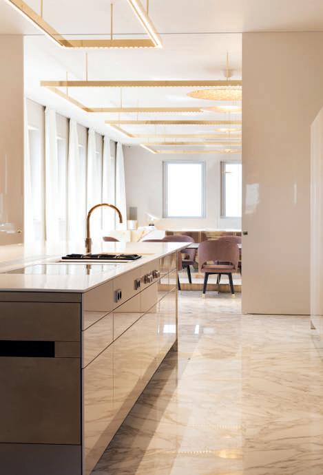 nelle diverse stanze. Calacatta, rovere, vetro specchiato e ottone si abbinano in forme armoniose, ottenendo un risultato caldo e singolare. La tonalità caramellata, caratteristica del Calacatta oro, è esaltata dalla presenza del colore dorato, conferito non solo dall’ottone, ma anche dal riflesso dei vetri, conferendo alla dimora un’atmosfera quasi festosa.