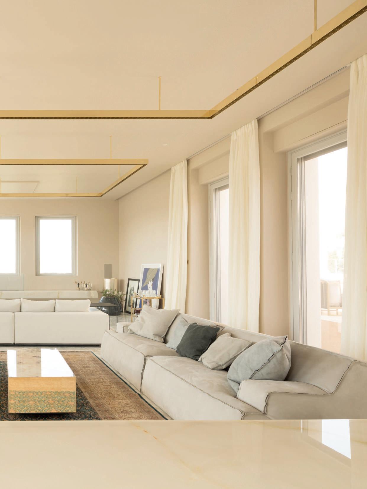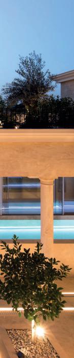 zione è ospitata da vasi di travertino collocati lungo i perimetri delle terrazze, formando così una cornice che si fonde con le chiome dei pini della Città Eterna. Sulla terrazza principale, i limoni sono disposti al centro come elementi individuali che contribuiscono a distribuire lo spazio insieme al camino. Il fuoco, che troviamo sia all’interno sia all’esterno della dimora, è presentato come elemento complementare che chiude le zone giorno, valorizzando gli spazi di incontro. La Villa sul Palazzo è completata dalla realizzazione di un giardino al piano più alto, un elemento che si integra con l’ambiente circostante conferendo alla dimora anche tratti “eco-green” piuttosto insoliti in città.