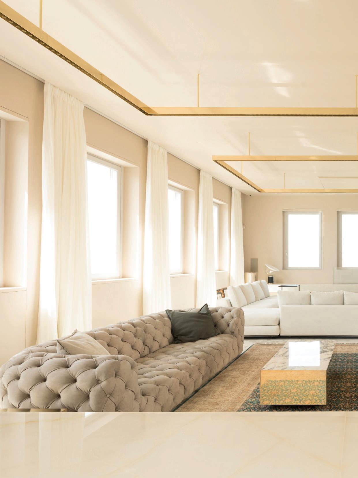 Negli interni, gli spazi contemporanei generati con materiali presenti in città si coniugano in perfetta armonia con gli arredi classici. E il valore di questa relazione è rafforzato dalla disposizione scultorea di questi pezzi, che provengono da collezioni di antiquariato. Gli ambienti principali sono definiti dagli arredi. Le grandi lampade rettangolari in ottone, realizzate appositamente per questa dimora, delimitano le diverse aree dal piano del tetto. L’architettura preesistente coesiste con nuovi programmi. Il colonnato, caratteristico dell’architettura neoclassica, ospita
