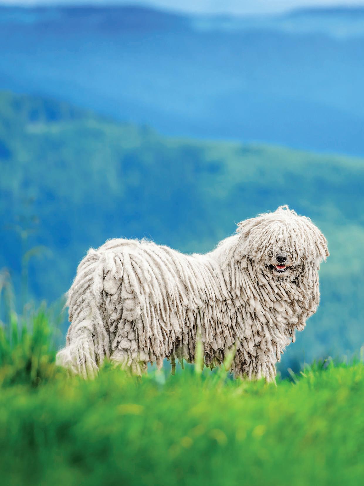 Razza dall’aspetto davvero particolare, colpisce immediatamente per via del suo fitto mantello bianco che lo ricopre totalmente, tanto che quando si sdraia ricorda un tappeto. Il mantello è formato da lunghe trecce che scendono fino a sfiorare il suolo. Si tratta di una sorta di “armatura” che protegge dal freddo gelido della pianura ungherese nell’inverno, dal caldo estivo, dalla pioggia e dai morsi dei predatori. E sì, perché il Komondor è un cane da protezione del bestiame. Le radici della razza risalgono a oltre mille anni fa, quando i Cumani, pastori nomadi giunti in Ungheria dalle steppe tra il Don e il Mar Nero, portarono con sé questi grandi cani bianchi, allora chiamati Quomandor. Per secoli il Komondor è rimasto confinato alla vita pastorale, selezionato per funzionalità e carattere. Questo isolamento ha permesso di conservare quasi intatte le caratteristiche originarie relative a morfologia, temperamento e mentalità. È un cane riflessivo ma con grande autonomia decisionale: osserva, analizza e poi sceglie se e come agire. Con la sua famiglia sviluppa un legame profondo. È protettivo e affettuoso ma mai “dipendente”. Ovviamente, è molto territoriale e questo significa che non è adatto a chi vive in ambiente urbano. La cura del mantello richiede impegno: nei primi mesi è soffice e lanoso, poi pelo di copertura e sottopelo iniziano a intrecciarsi e formano le “corde”. Queste ultime non vanno pettinate né spazzolate ma separate una per una a mano per permettere alla pelle di respirare.
