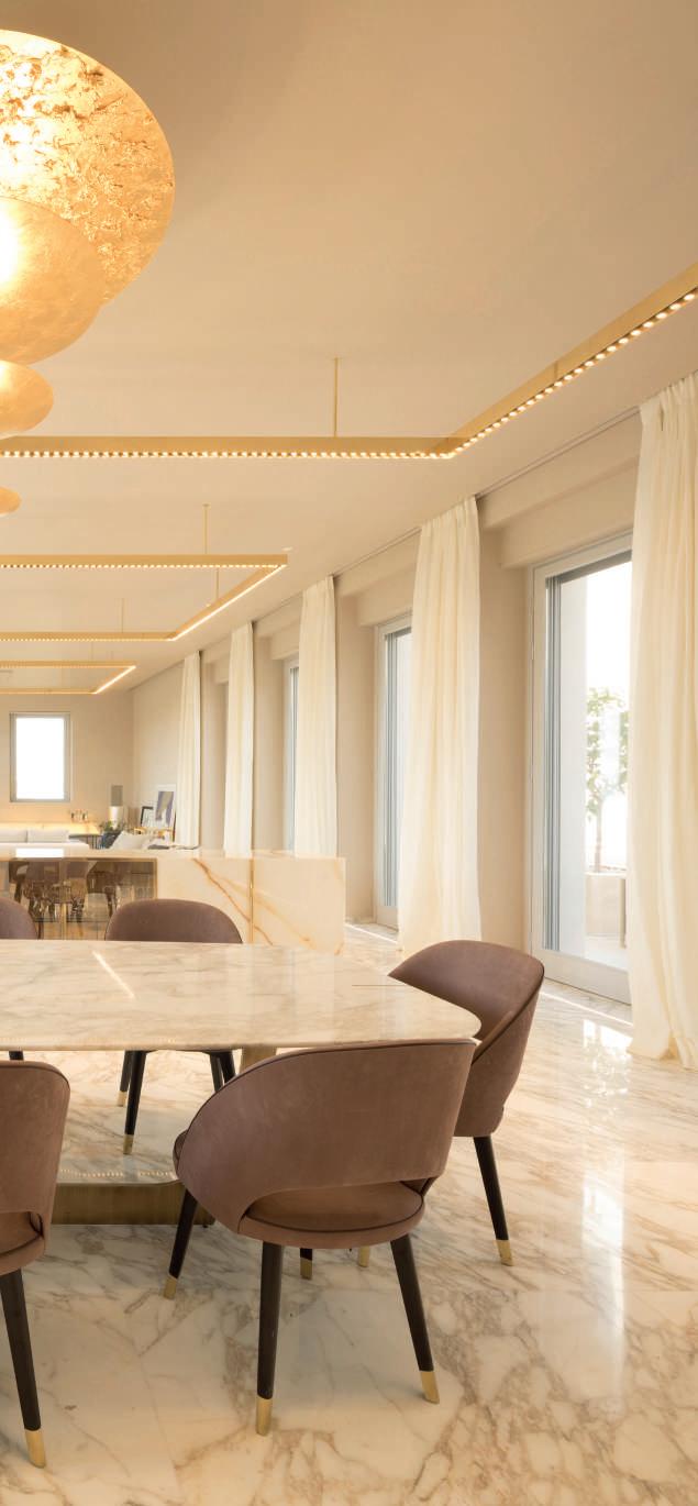 NEL SALONE: TAVOLO ONYX MARBLE, DISEGNO RAMON ESTEVE; SEDIE COLETTE BAXTER; CREDENZA CALACATTA GOLD MARBLE, DISEGNO RAMÓN ESTEVE; ILLUMINAZIONE Q3 LIGHT DI ITALIAN BAXTER, TAVOLO DA CAFFÈ ELLIOTT COFEE TABLE DI MINOTTI. JUAN USLÉ PICTURE