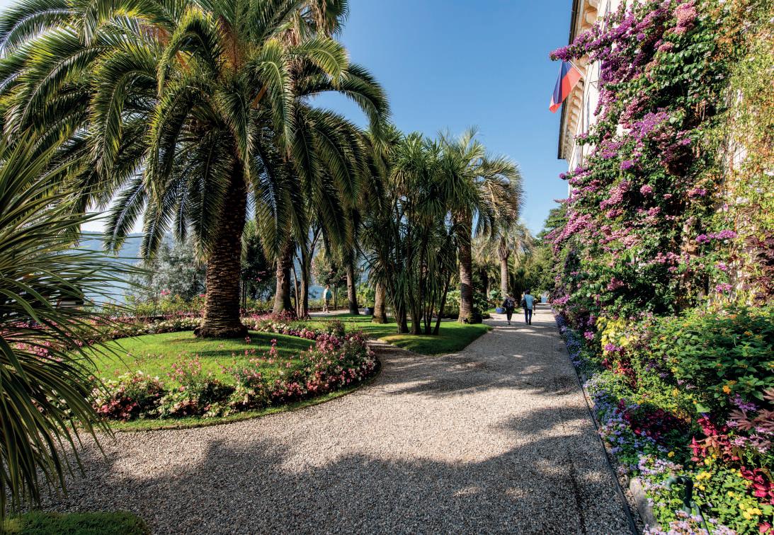sublime: mantenne l’impostazione generale del Cagnola ma diede al luogo suggestioni romantiche e volutamente disordinate e naturali. È il microclima mite ad aver permesso a rarità botaniche subtropicali che Vitaliano IX fece arrivare un po’ da tutto il mondo di acclimatarsi. Tra tutte le storie di questi “viaggi botanici” ricordiamo il cartoccio di semi che arrivò dal Tibet nel 1862: “Li faccia piantare subito: sono di una specie di cipresso del Kashmir che sarà propizia per i boschi del Lago Maggiore”, scriveva il botanico William Pentland al Borromeo nella lettera di accompagnamento. Ora questi semi sono diventati un gigante di 25 metri di altezza dal fogliame verde-azzurro che sorge davanti al palazzo con un tronco di quasi 8 metri di diametro. Si tratta del più antico e grande esemplare di questa pianta presente in Europa, oltre che il simbolo dell’Isola Madre. Ed è diventato ancora più prezioso dopo che, sradicato da una tromba d’aria nell’estate del 2006, è stato salvato grazie a un elabo-