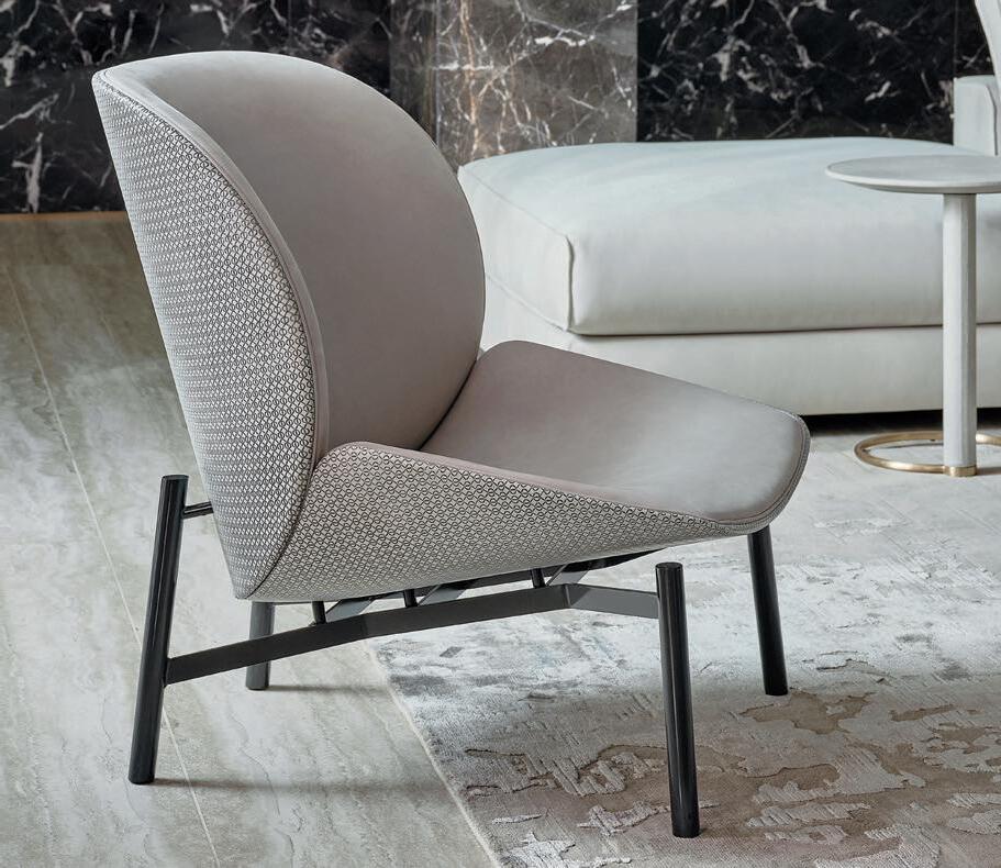 La poltrona riprende le linee morbide e la centralitàdella materia legno dell’omonima collezione