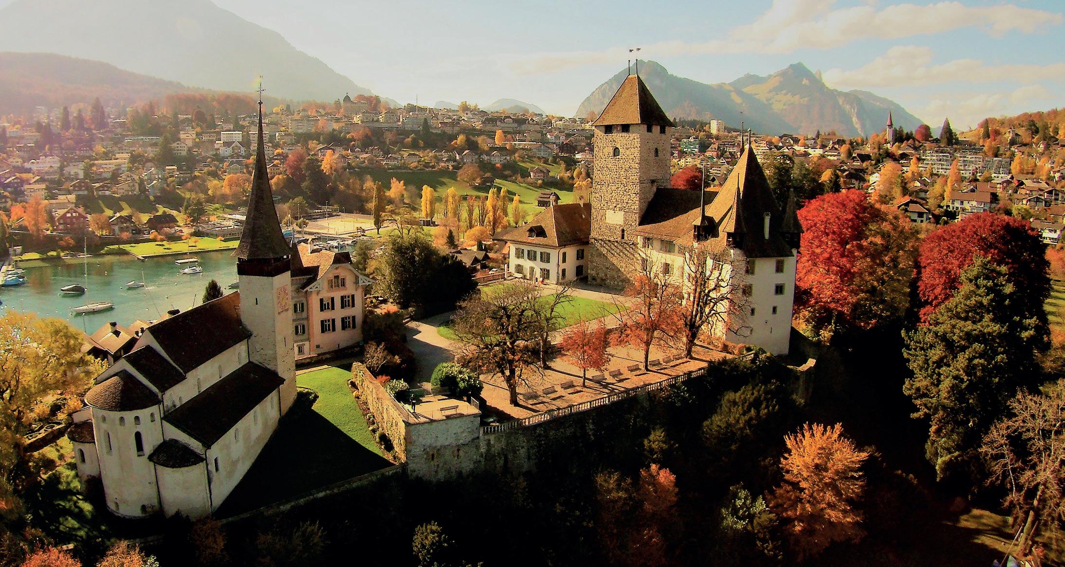 paterna, è all’altezza del personaggio. Le tre torri di fortificazione di granito dell’imponente ala principale sono sormontate dalle iconiche cupole a cipolla e racchiudono l’elegante quadrangolo porticato, di ispirazione rinascimentale. Oltre all’amministrazione comunale di Briga-Glis e al tribunale distrettuale, ospita l’Istituto di ricerca per la storia delle Alpi e, naturalmente, custodisce le collezioni della famiglia, oggetti relativi all’etnologia e alla storia culturale dell’Alto Vallese, mentre la mostra “Passage Simplon” mette in evidenza la movimentata storia del Passo. Tornando sul lago di Thun, una crociera può condurre ad altri due castelli che vi si affacciano oltre a quello di Oberhofen. Il castello di Spiez vanta una storia lunga e complessa, segnata da numerosi passaggi di mano. Già sulla scia della conquista alemanna sorse sulla penisola dell’insenatura di Spiez un centro di dominio. La chiesa del castello, in stile romanico, con i suoi affreschi, rappresenta un ulteriore gioiello, splendide anche con le stuccature in stile barocco del ticinese Antonio Castelli, che decorano lo sfarzoso salone delle feste che Franz Ludwig von Erlach fece aggiungere nel 1614. Oltre all’esposizione storica, ospita spesso mostre d’arte, ma anche attività come l’addestramento cavalleresco per i più piccoli. Inconfondibile con la mole massiccia del suo corpo scandita dalla quattro torri, il castello medievale di Thun troneggia sull’omonimo lago e su Berna. Da metà del 2014 vi sono stati inaugurati un centro