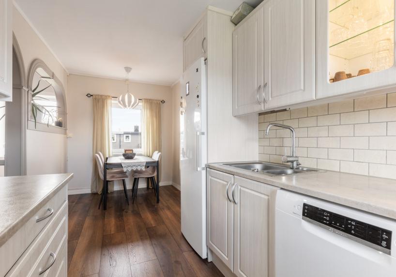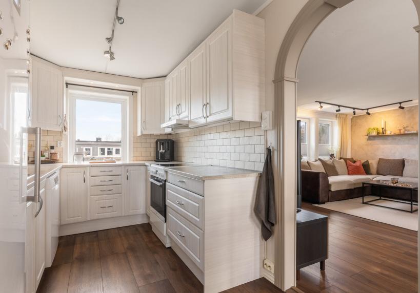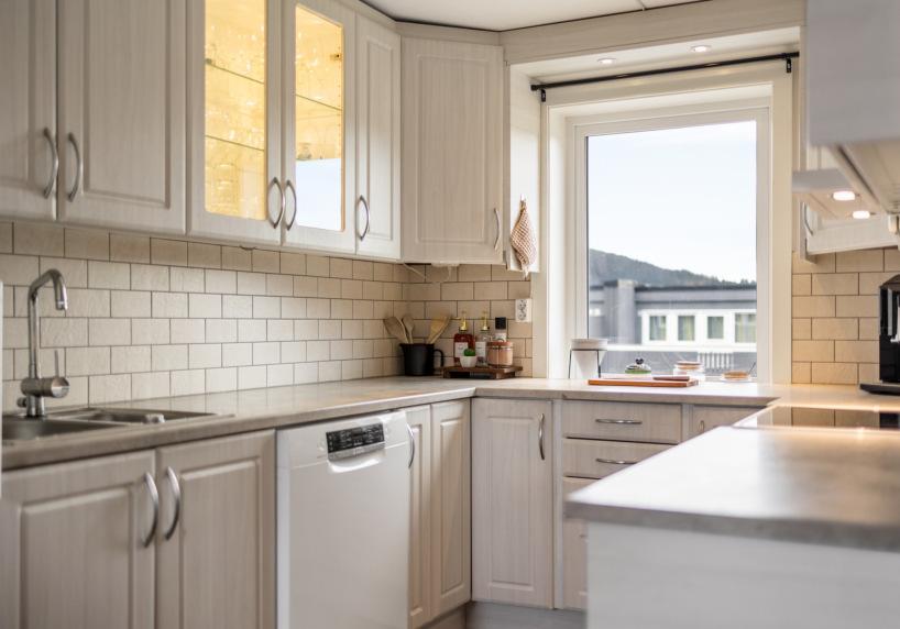 7. KJØKKENINNREDNING medfølger, herunder også åpne, fastmonterte hyller og løs eller fastmontert kjøkkenøy.