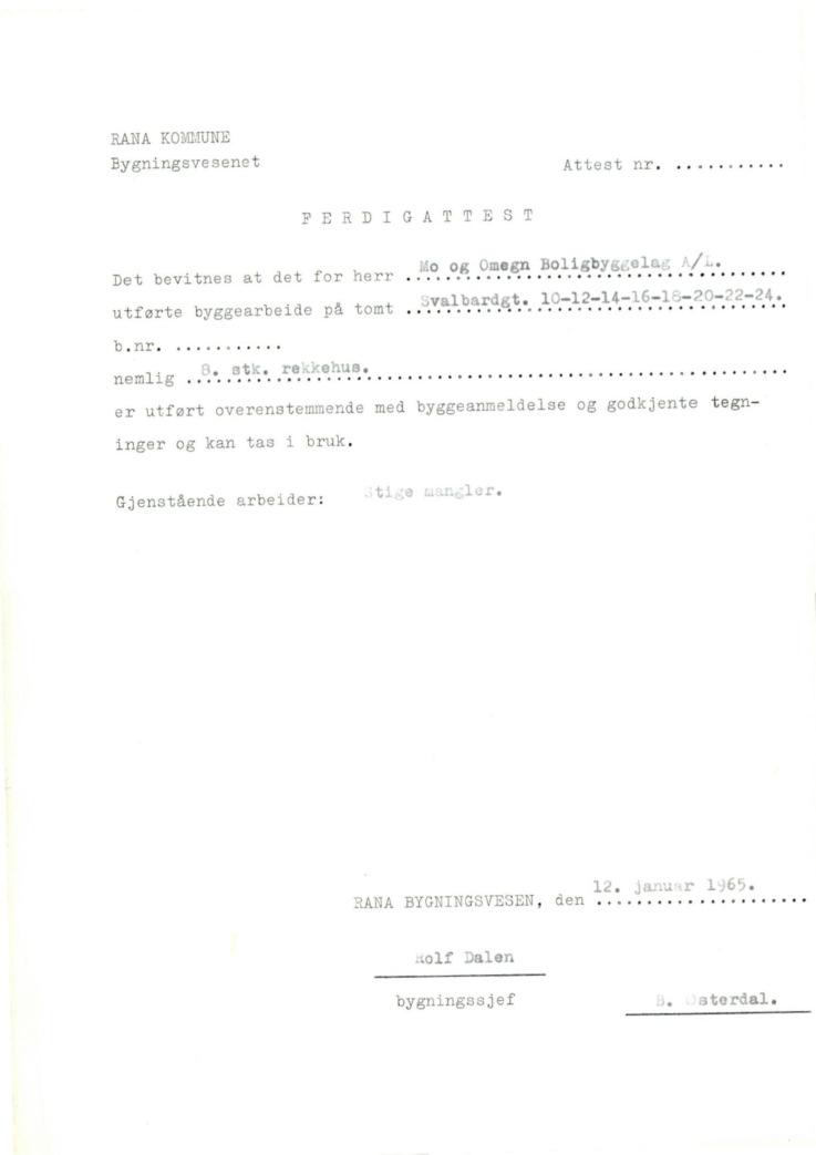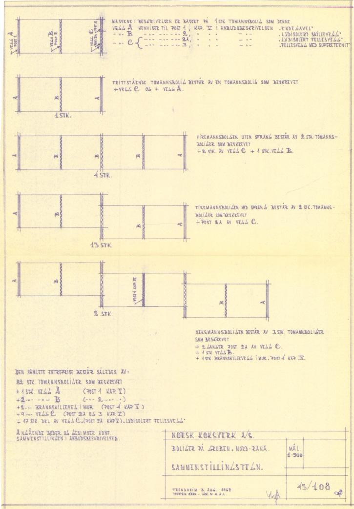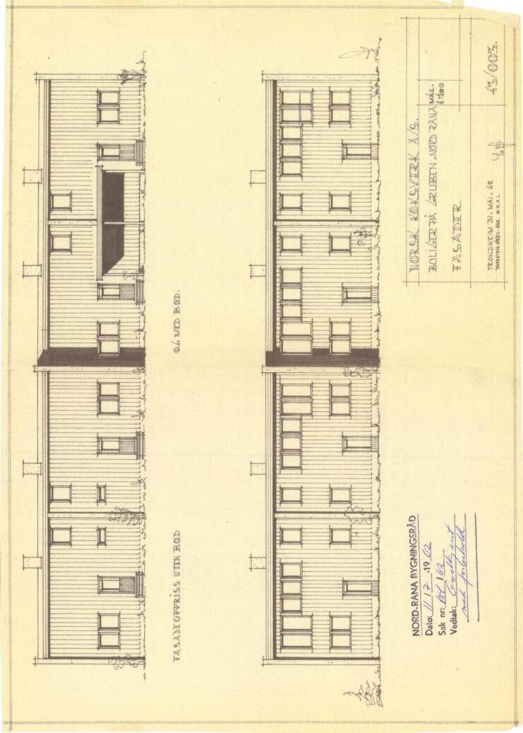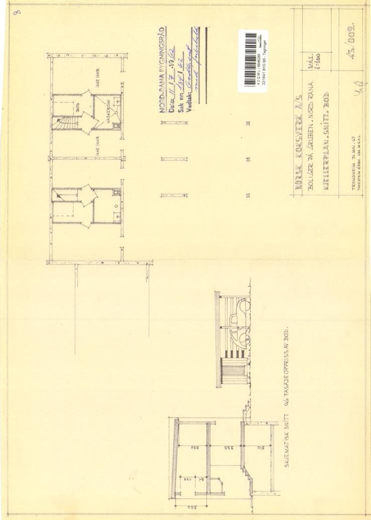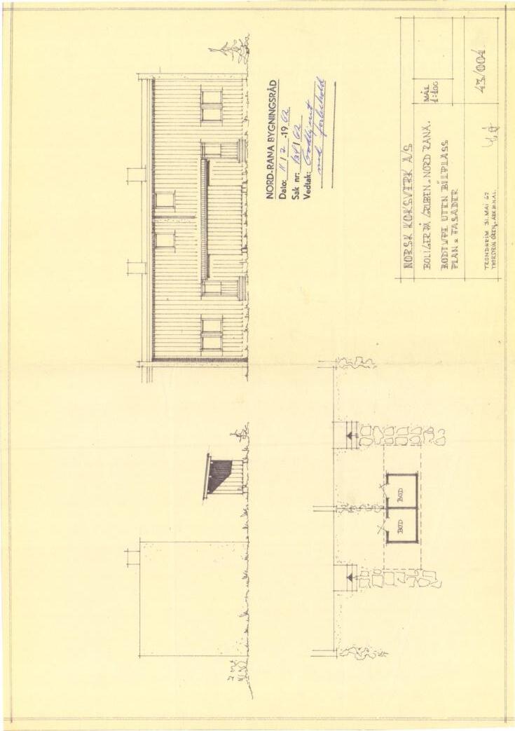 Boligbygg oppført i 1964. Grunnmur av betong. Fundamentert på ukjent byggegrunn. Bygget er oppført med støpt gulv mot grunn. Yttervegger av trekonstruksjoner. Fasaden er kledd med liggende trekledning. Etasjeskillere av trekonstruksjoner. Pulttak i trekonstruksjoner (ikke besiktiget). Yttertak er utvendig tekket med asfaltpapp. Entrédør med glassfelter. Vinduer i forskjellig utførelse, fra forskjellige årstall. Balkongdør