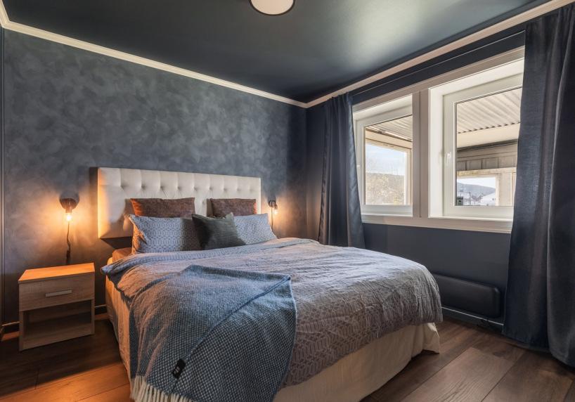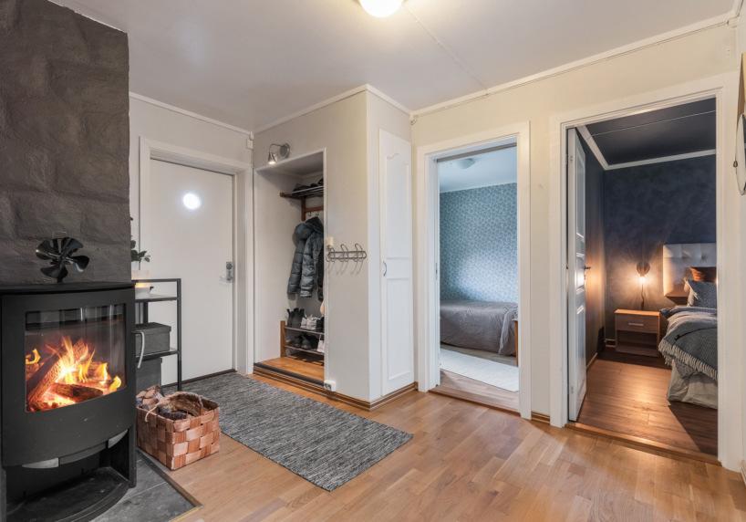 med karmer av plast, og tre-lags glass. Peisovn i gang. Øvrig oppvarming med elektrisitet. Ventilasjon med naturlig tilluft kombinert med stedvis mekanisk avtrekk.