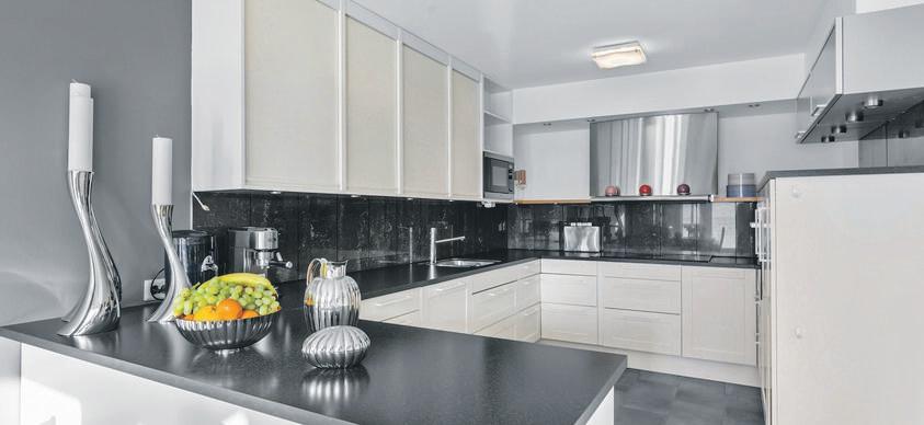 Det 38 kvadratmeter store kjøkkenet er som hentet ut av et interiørmagasin: Her kombineres svart, moderne inn redning med integrerte hvitevarer og benkeplater i stein, med lyse vegger og gulv, klassiske vinduer og høyt tak med rosetter og lysekrone. Synlig metall er, som i leilig heten forøvrig, holdt i sort og gull. Fra en sjenerøs kjøkkenøy med innfelt avtrekk i kokesonen kan vertskapet kokkelere og konversere middagsgjester i hyggelige kveldstimer, mens den majestetiske kakkelovnen i hjørnet sørger for lun varme og intim atmosfære.