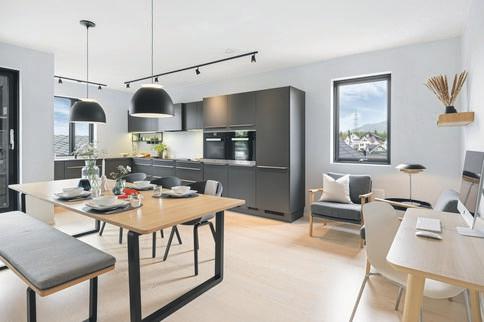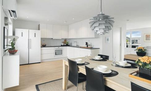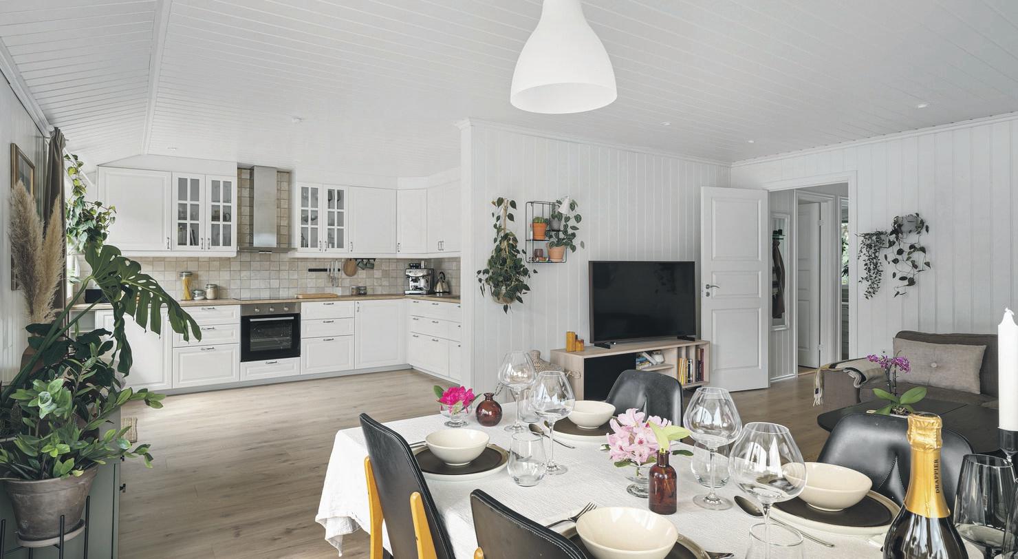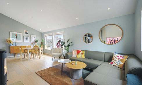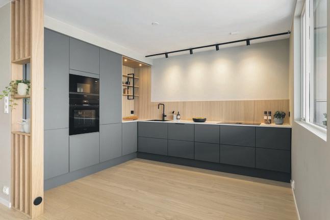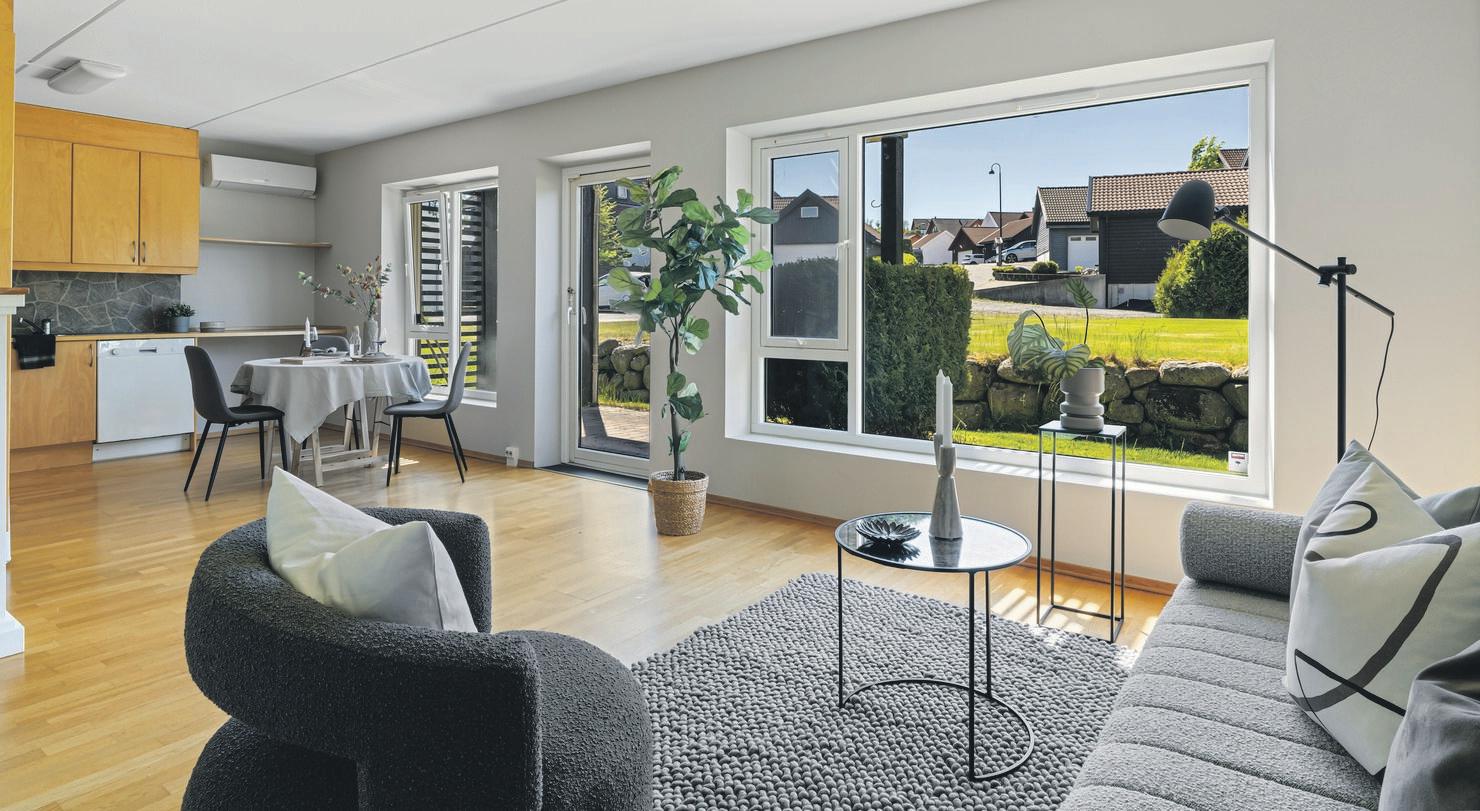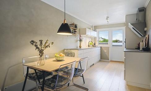 Vel inne er forvandlingen total. Her trer du inn i en helt ny, lekker leilighet som strekker seg over to innholdsrike etasjer. Kjøkkenet og den store stua ligger i en åpen løsning, med god plass til både spisestue og flere sittegrupper.