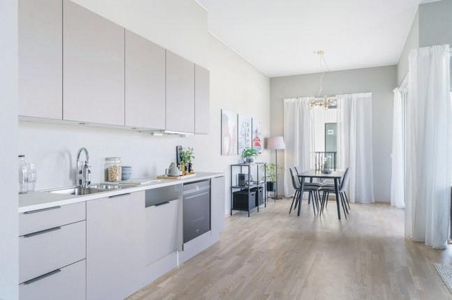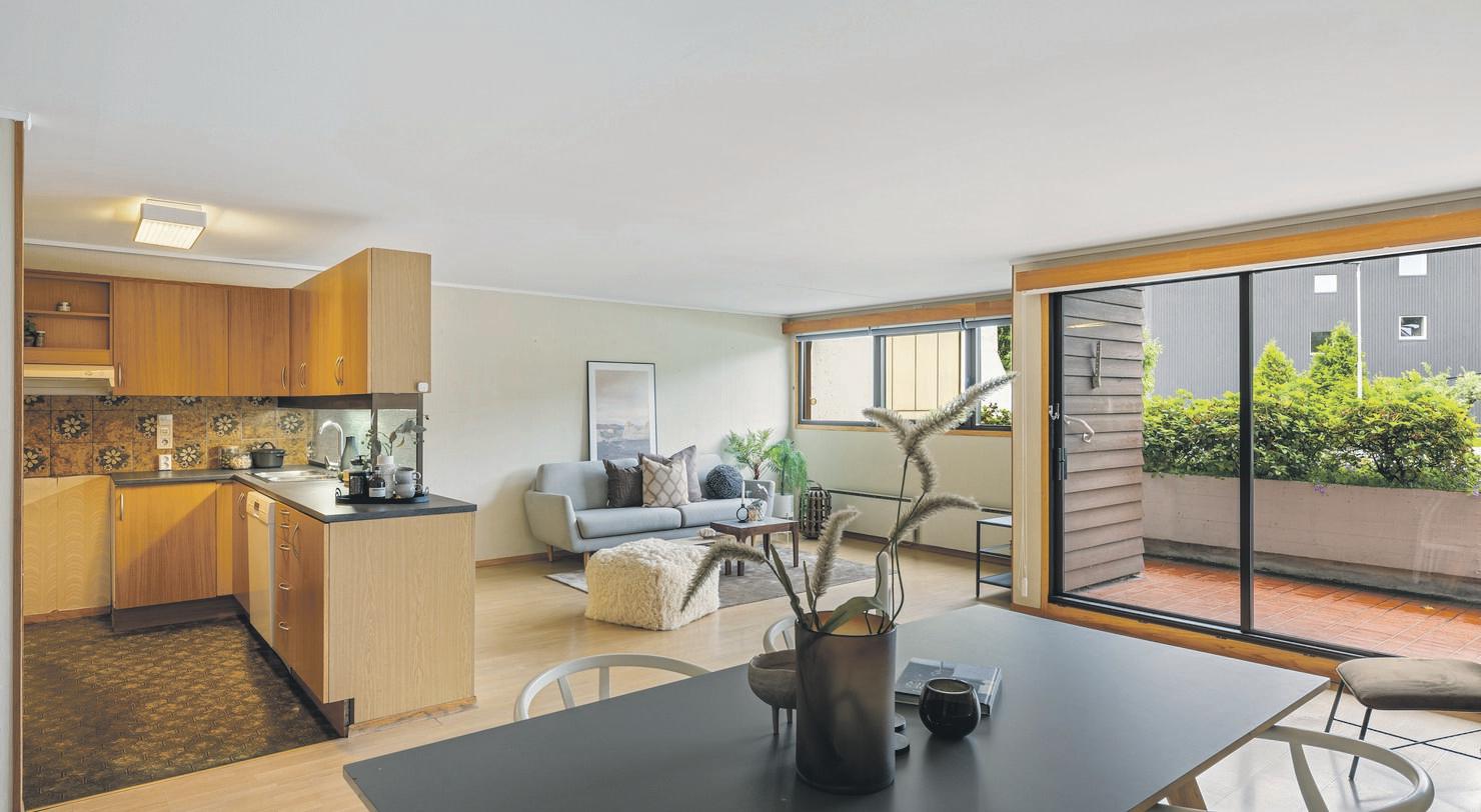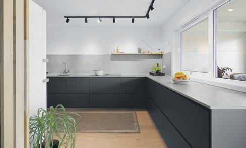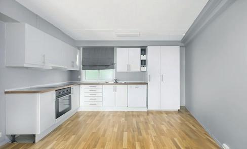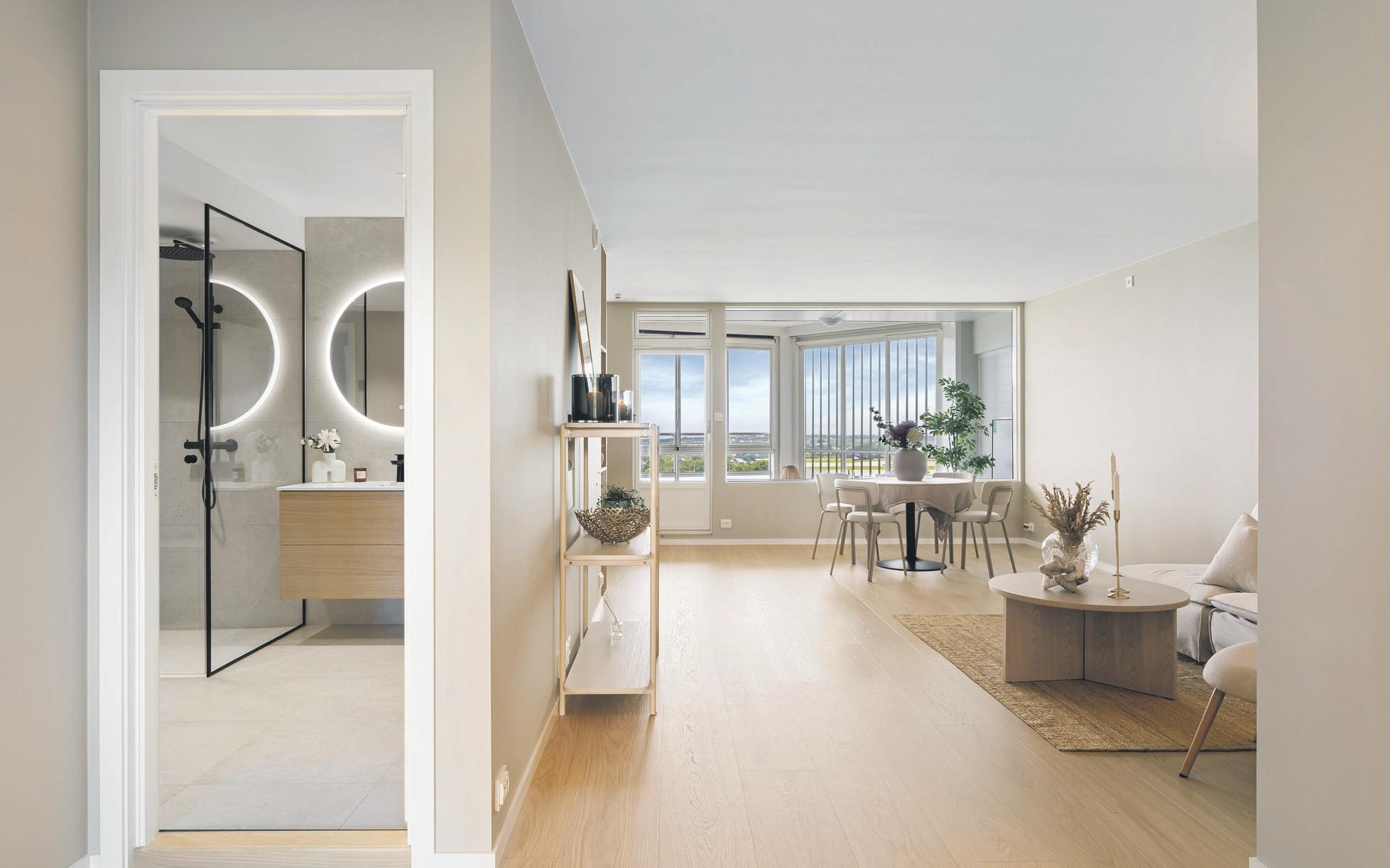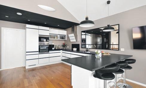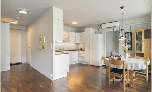 Vel inne er forvandlingen total. Her trer du inn i en helt ny, lekker leilighet som strekker seg over to innholdsrike etasjer. Kjøkkenet og den store stua ligger i en åpen løsning, med god plass til både spisestue og flere sittegrupper.