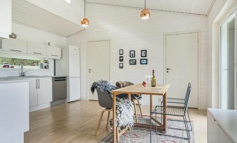 Hytten er delikat, innbydende og har en fin flyt i romløsning, samt flyt mellom inne og ute. Herlig, gjennomgående naturlig lys setter preg på trivselen.