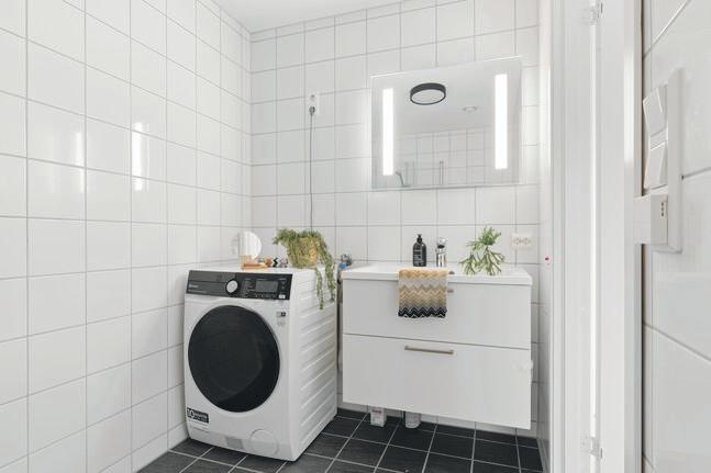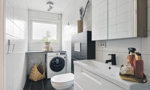 * Flott todelt bad og vaskerom med fliser på gulvet.