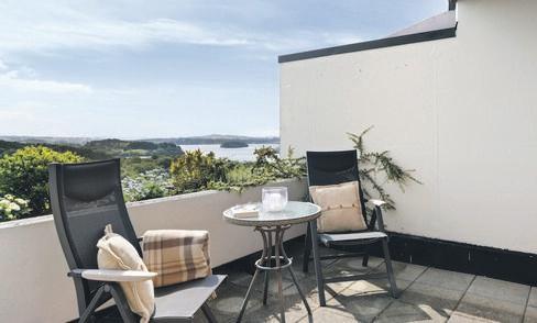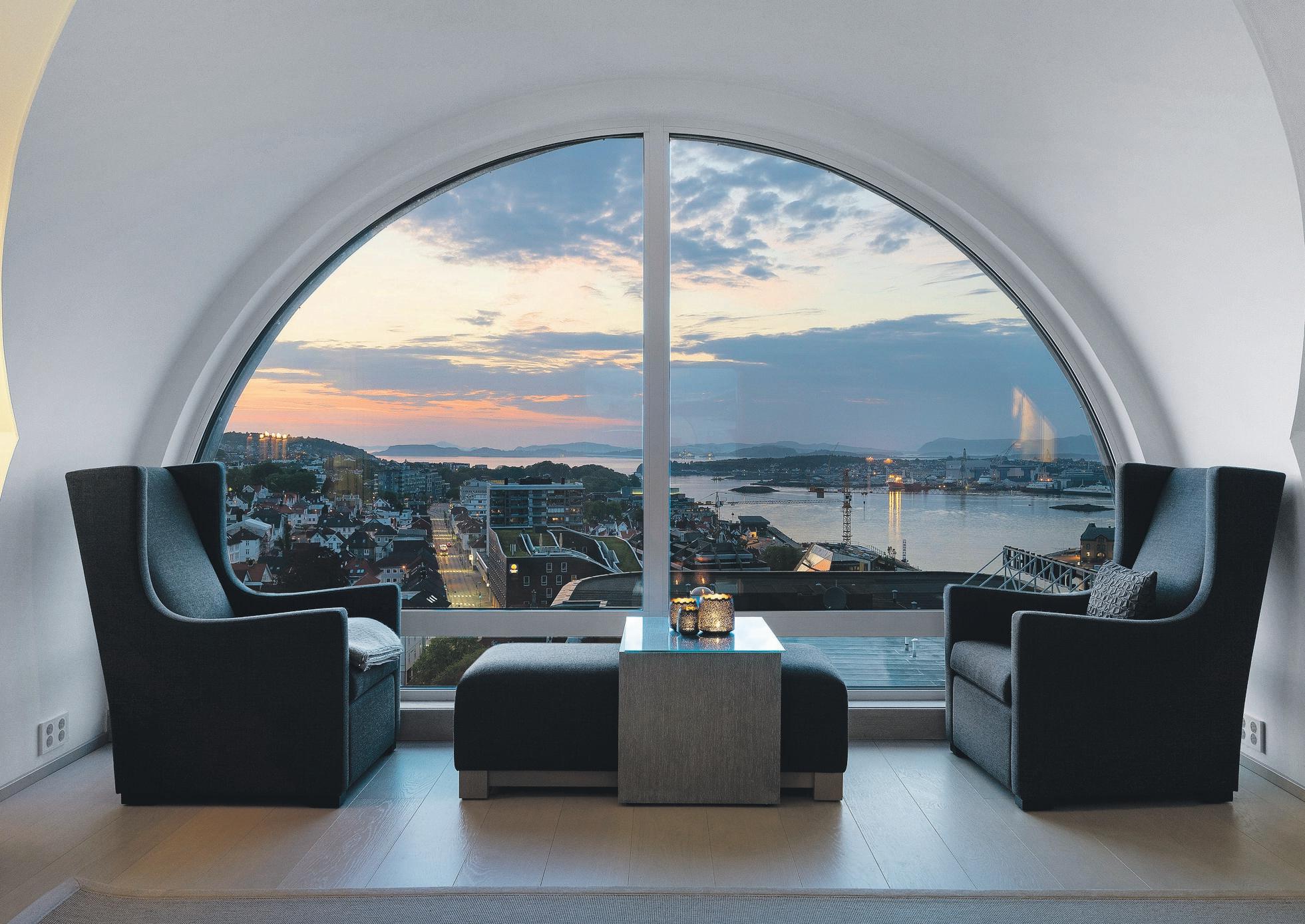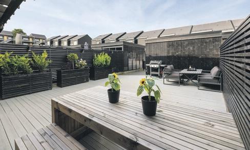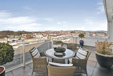 2 store takterrasser: 21 m² mot nord og øst med formiddagssol og 23 m² mot sør og vest med utsikt over Eiganes (ser helt til havet) med sol på dag og hele kvelden. Utg. fra henholdsvis peisestue og allrom. Fantastisk utsikt!