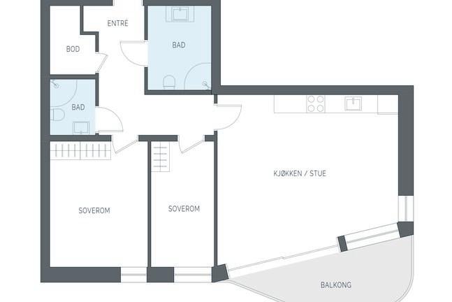 Innhold: Entré/gang, kjøkken, stue, wc, bad, vaskerom/biinngang, 2 sov, gang og walk-in closet.