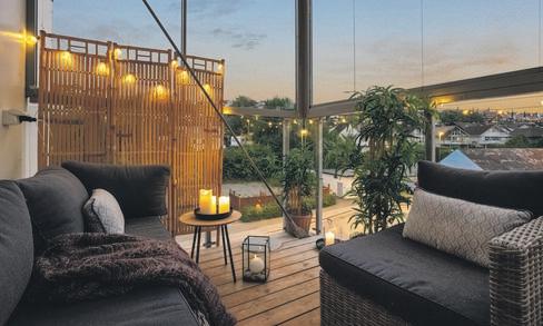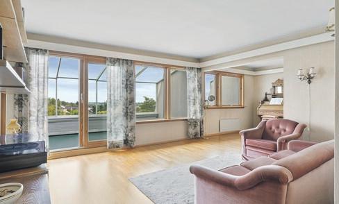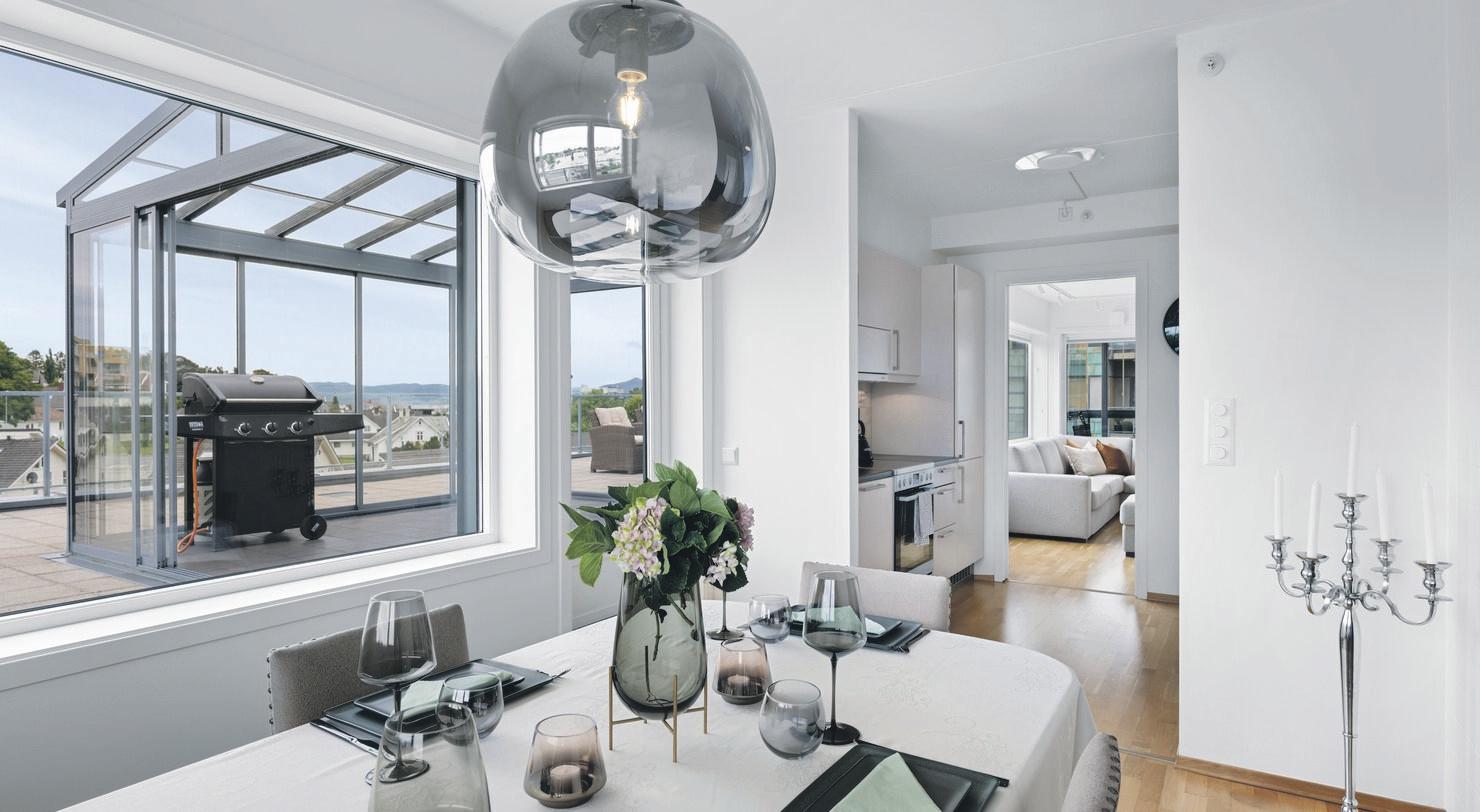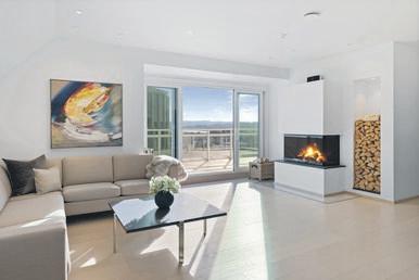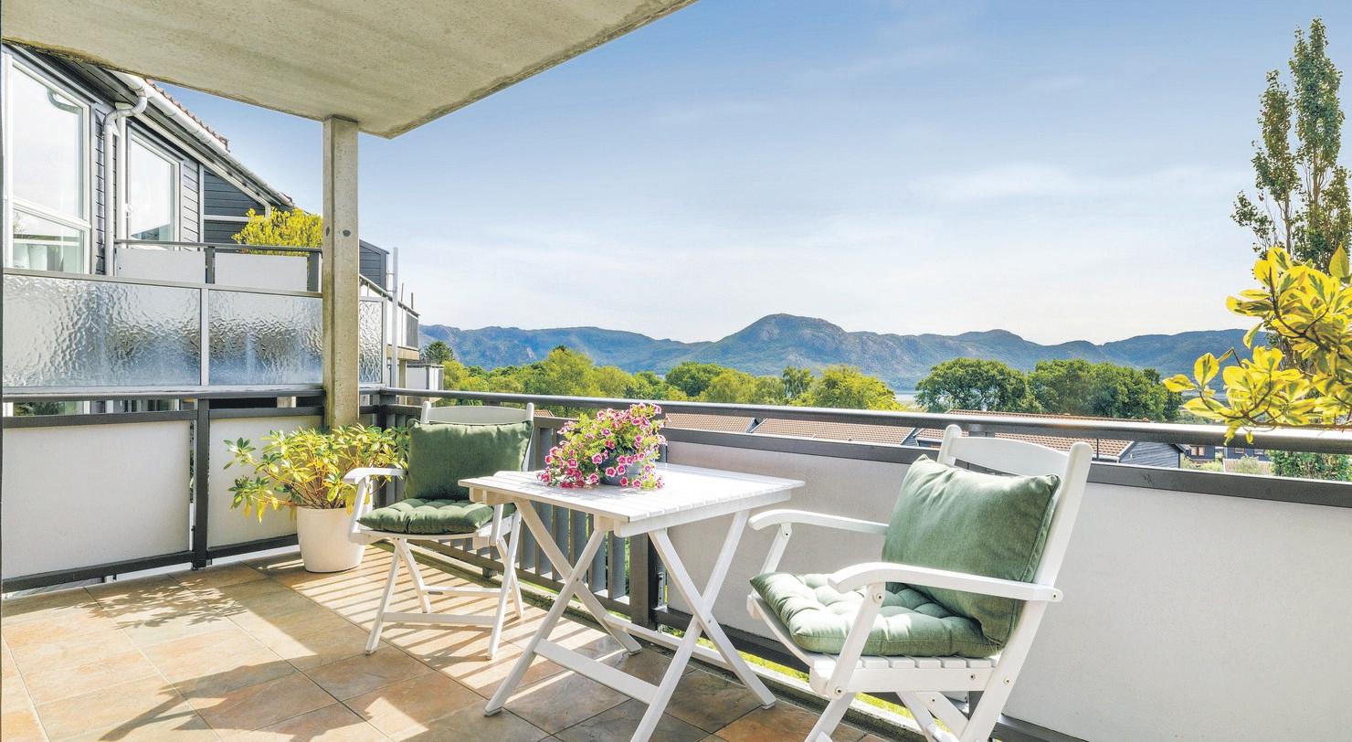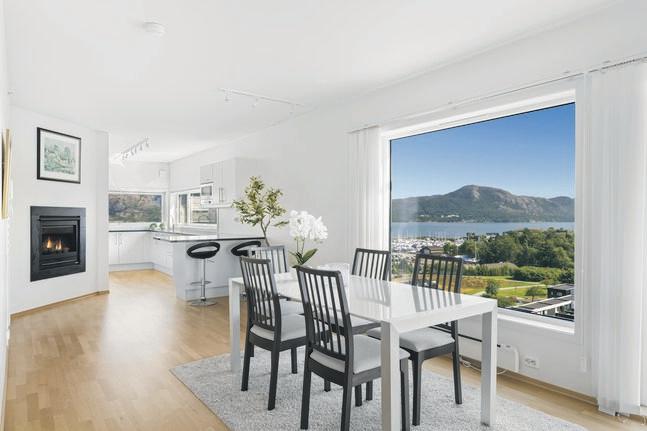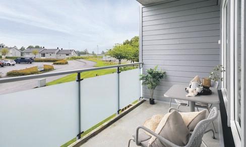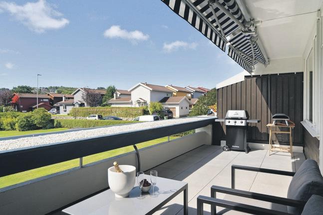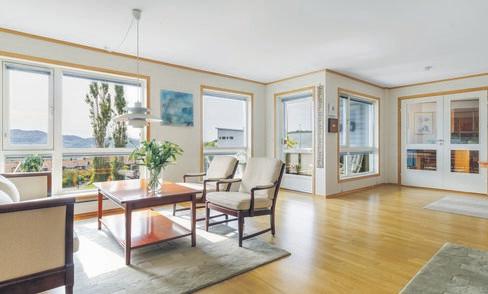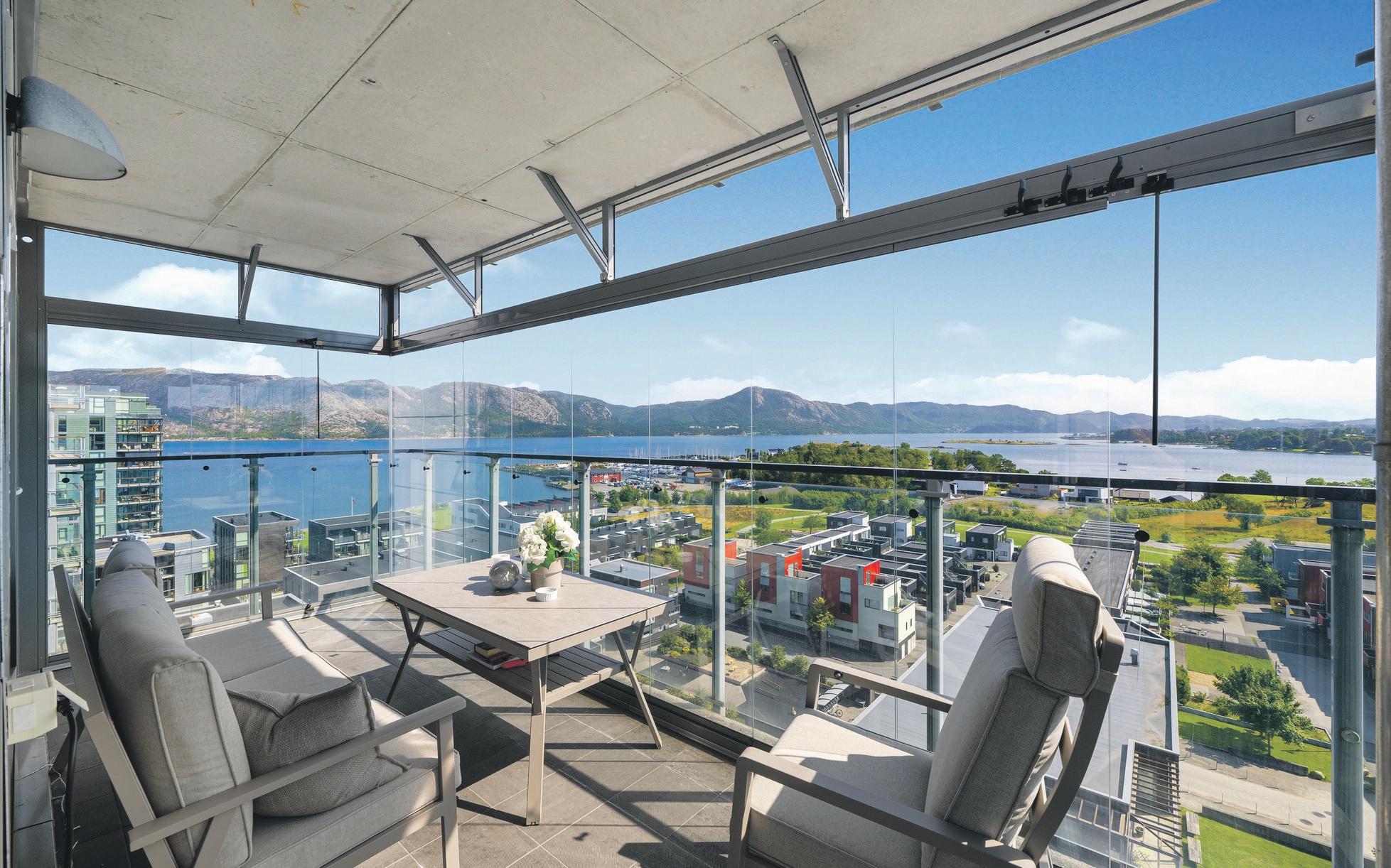 - 2 balkonger med fantastisk utsikt over nærområdet, sjøen og fjellene. Her ute har man også sol fra morgen til kveld da balkongene er vendt mot øst, sør og vest. Den sør/vestvendte balkongen er innglasset og på ca. 17kvm.