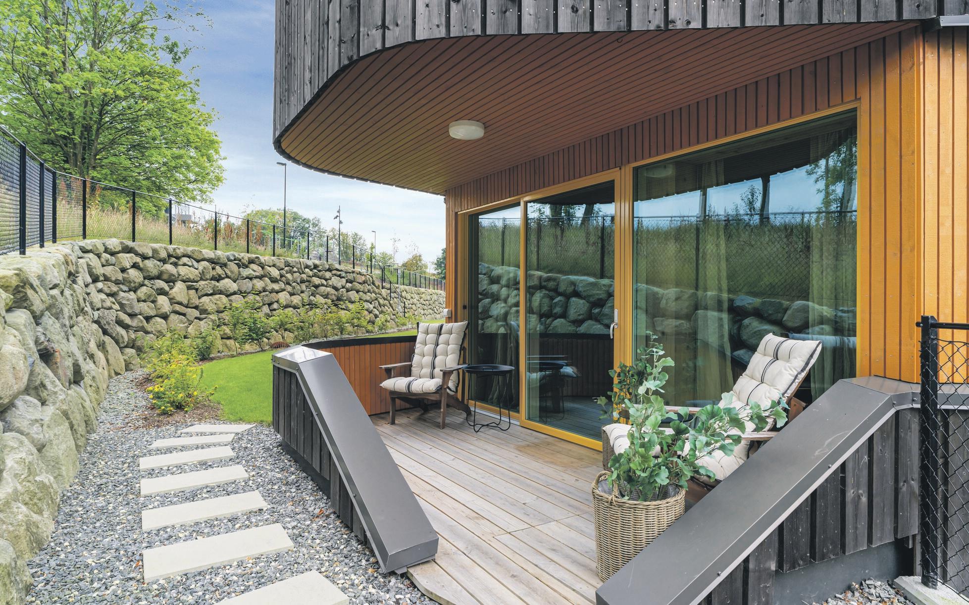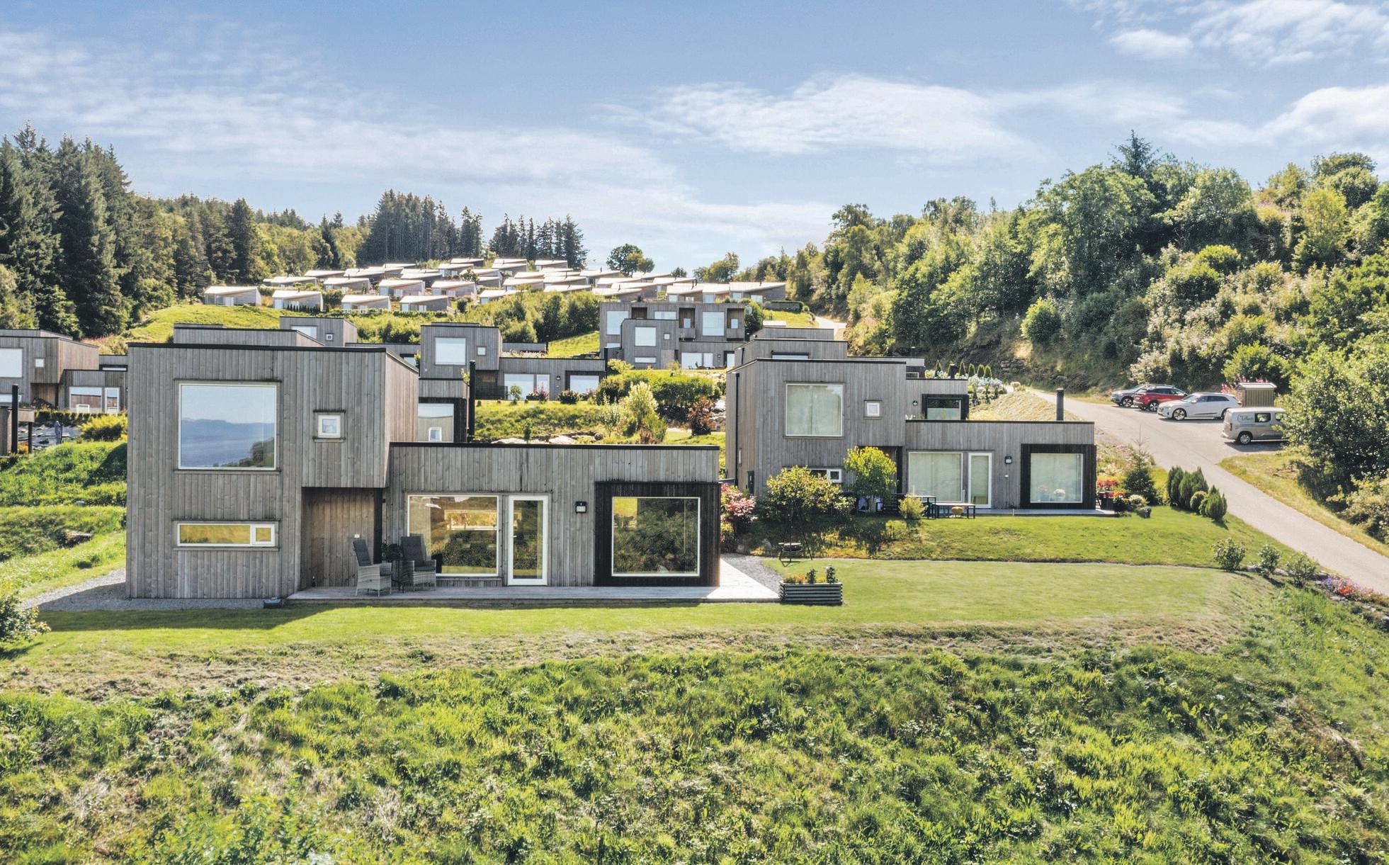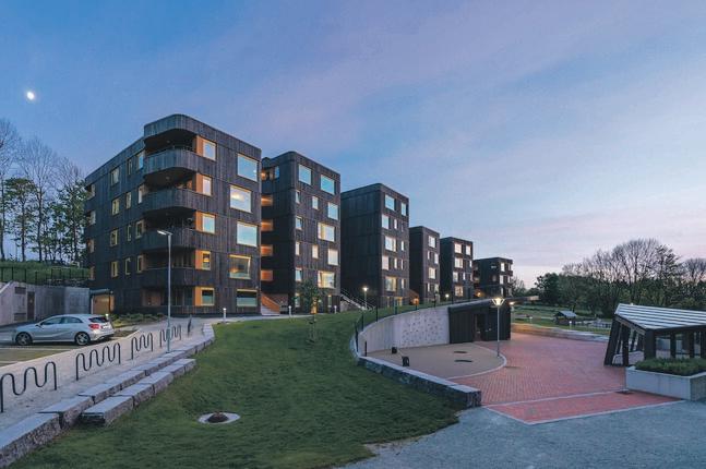 Husene i Skogen er arkitekttegnet av Helen & Hard. Mye naturlig lys, godt inneklima, flott utsikt, høy kvalitet i materialer som massivtre, praktiske løsninger og godt naboskap er bare noen av kvalitetene som øker trivselen