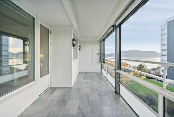 Flott utsikt til hav, fjell og bebyggelse. Leilighet med solrik og stor innglasset balkong på ca. 14 kvm. Nyere heis.