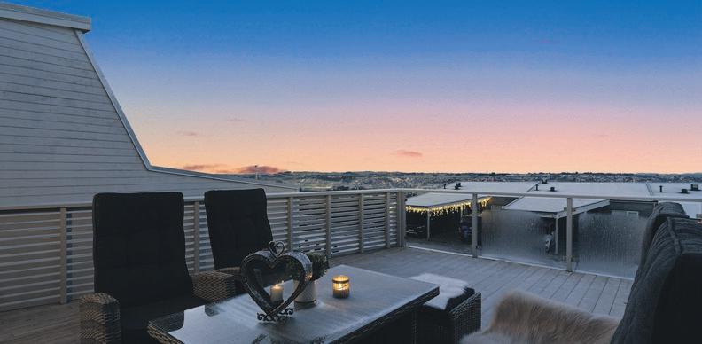 Herlig og sjeldent godt plassert på taket av Sandnes. Byen for dine føtter, uten innsyn og helt privat. Vestvendt terrasse med optimale solforhold og utsikt også mot parken i sør. Store vinduer gir herlig byutsikt, inne også. Åpent og luftig. Smart løsning hvor du fra romslig entre, umiddelbart har tilgang til bad m/eget, lite vaskerom og direkte tilkomst til to sov. Romslige m/plass til tv-stue/hjemmekontor. I stuen har du god plass til flere soner møblering. El-markiser. Kjøkken er delvis åpent mot stuen, men fint trukket tilbake. Vannbåren varme. God lagring i bod i svalgang, samt v/p-plass m/enkel tilkomst. Eget festlokale, samt overnatting kan leies.