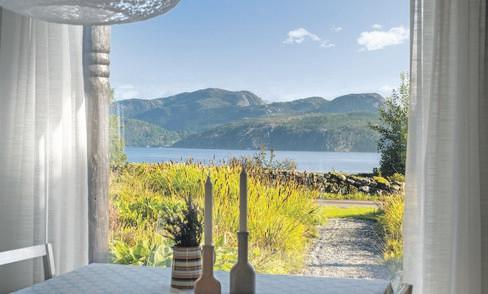 * Stuen med spiseplass, peiosovn og utgang til solvendt terrasse og plen med flott utsikt til fjorden.