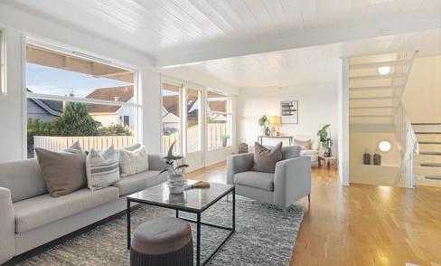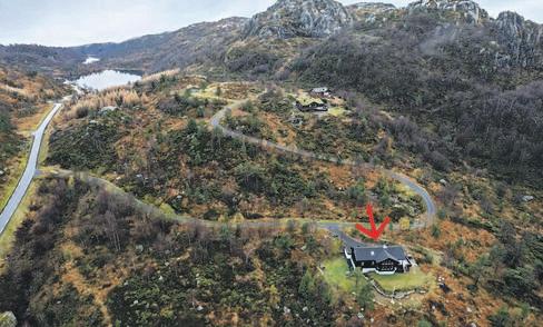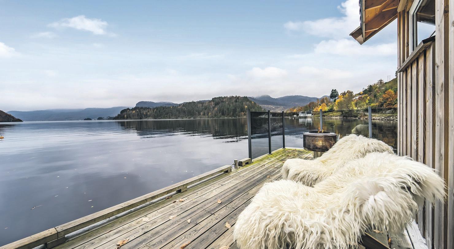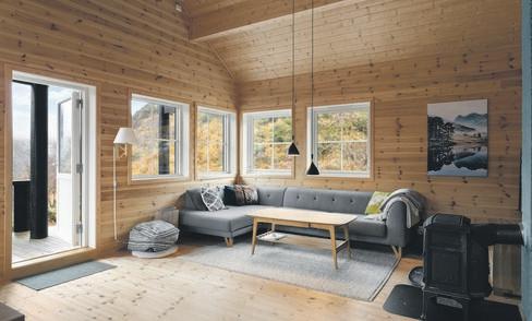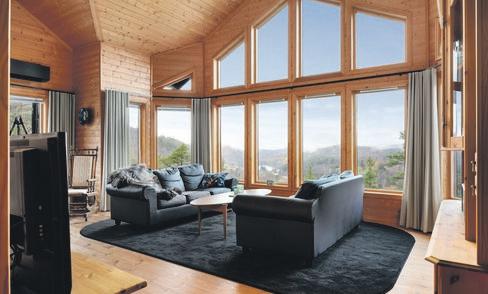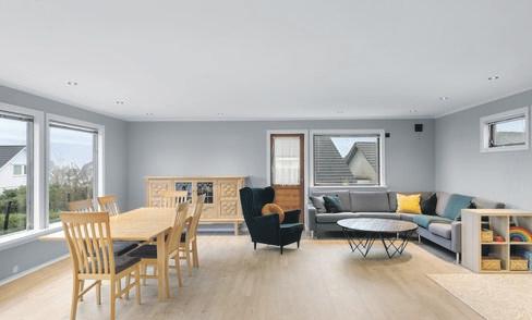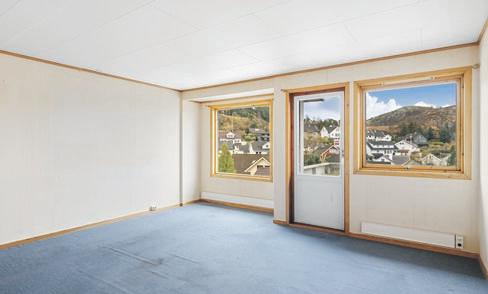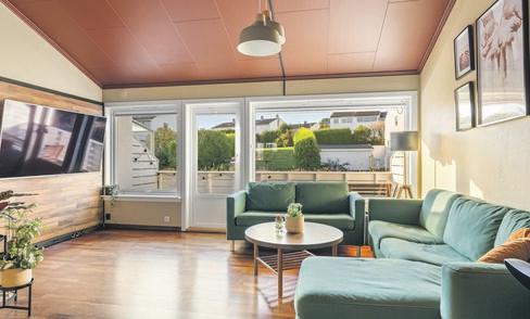 Særdeles flott utsikt fra stuen, med store vindusflater, god takhøyde og fri utsikt mot fjord og fjell.