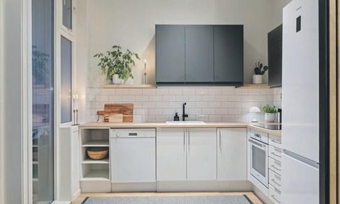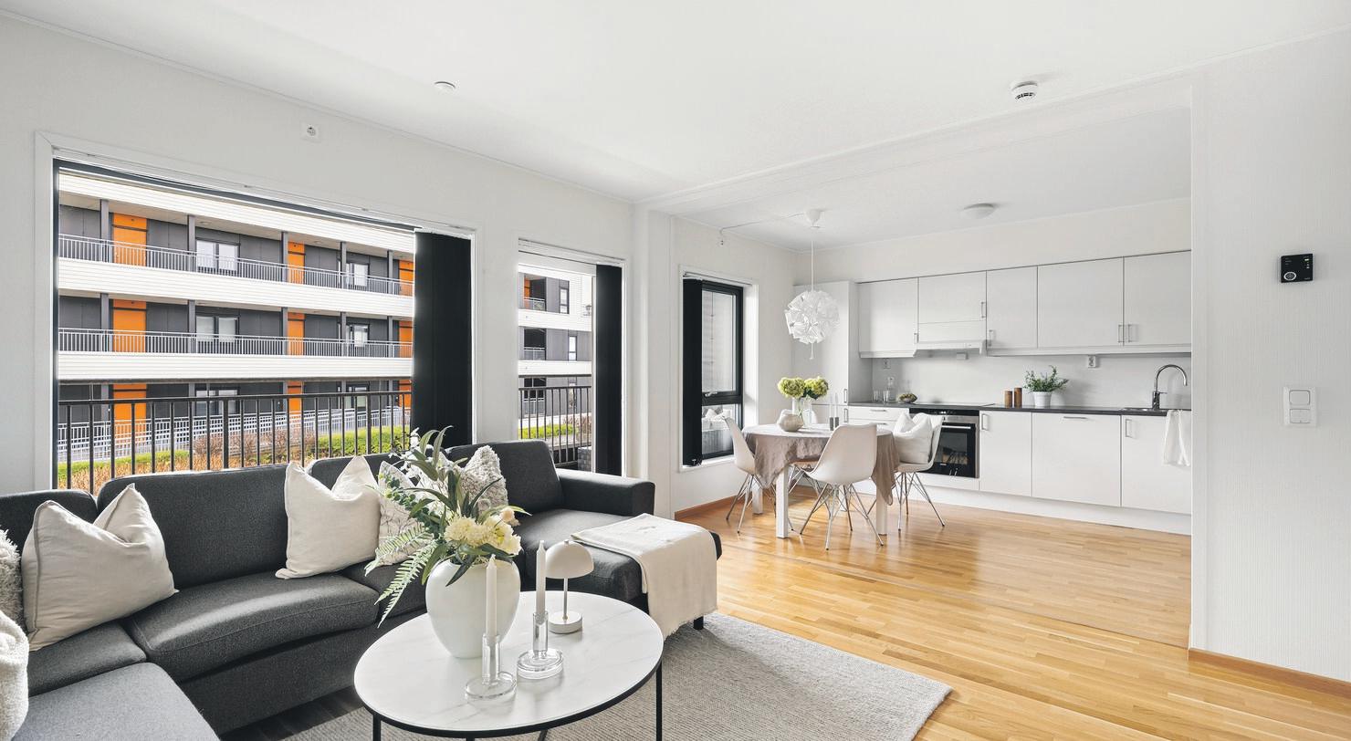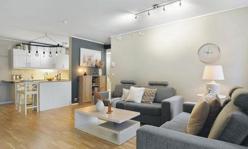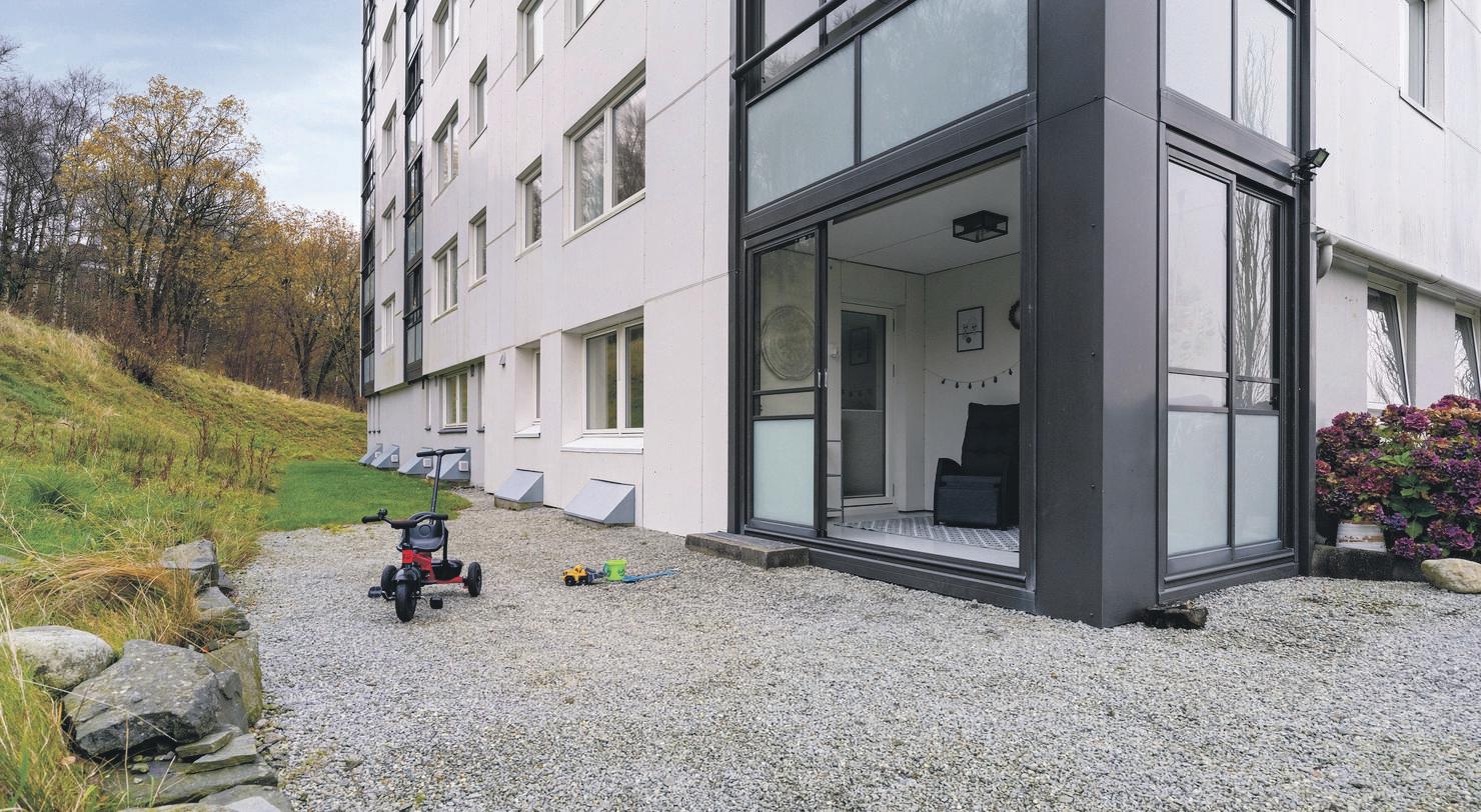 I utgangspunktet skulle denne artikkelen handle om tre forskjellige leiligheter som var til salgs. Før Boligavisen gikk i trykken, var den ene solgt og tre ble til to – på mange måter betegnende for livet her i dette prisbelønte boligprosjektet: Det er godt å bo her. Folk trives. Ikke minst på grunn av merverdien som følger med det å dele med andre. For her får du ikke bare en komplett, privat leilighet, du eier også en del av hele 500 kvadratmeter fellesarealer.