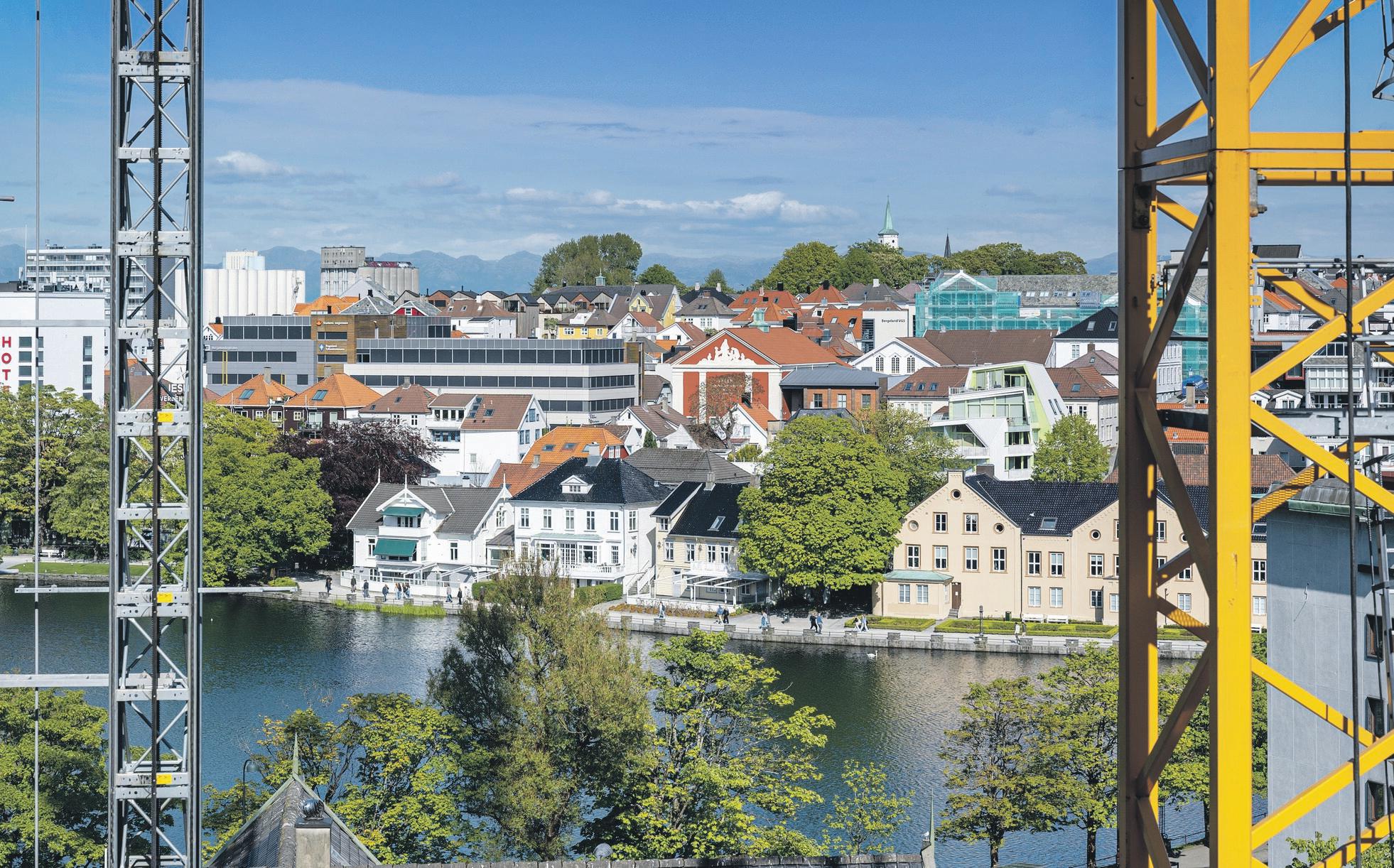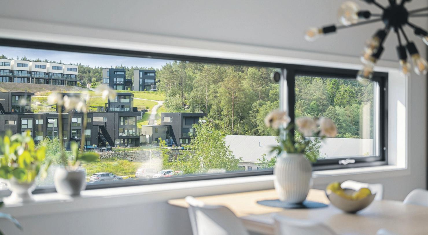 Høyhuset K8 tar form på tomten skrått foran leiligheten. Det er likevel fortsatt flottt.