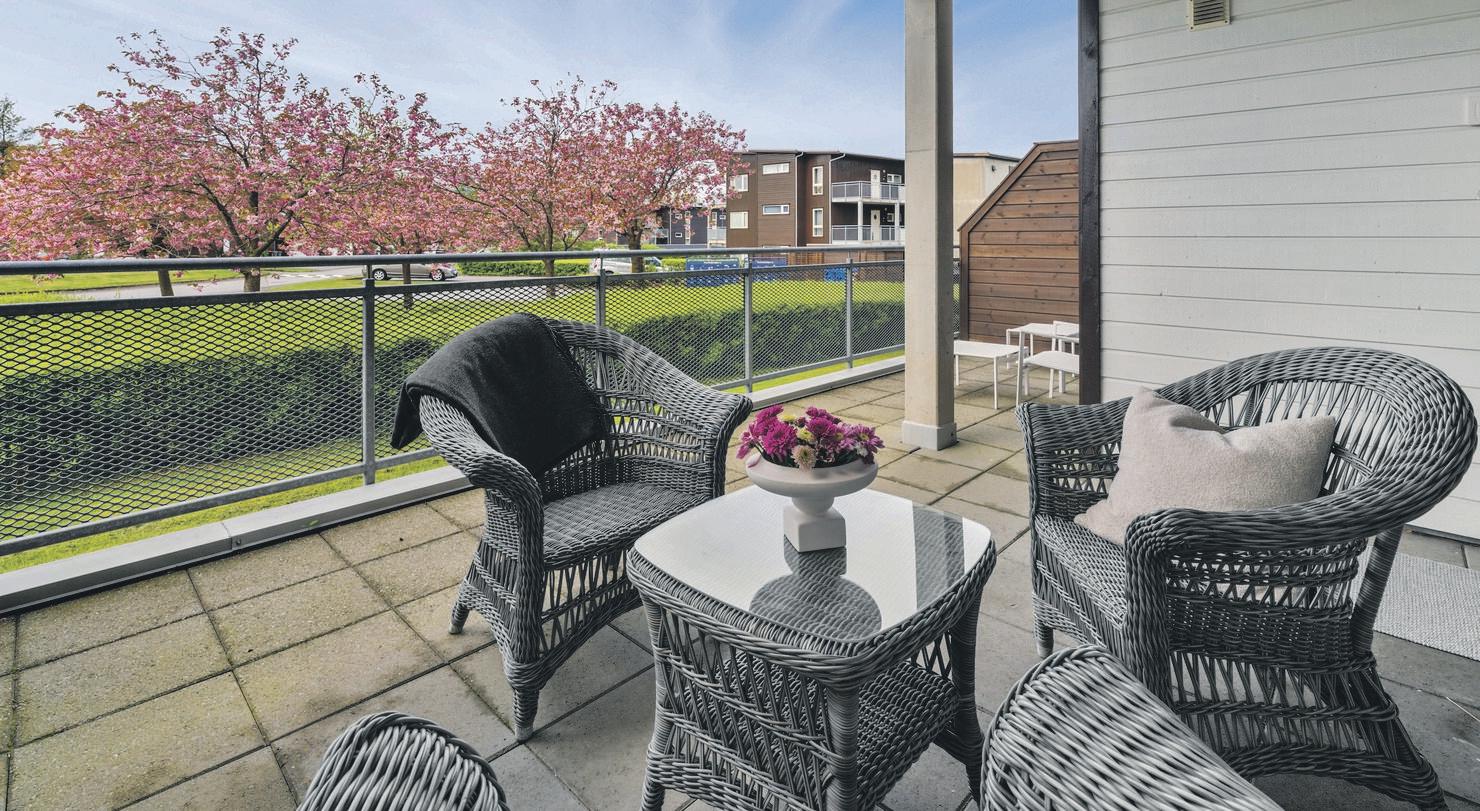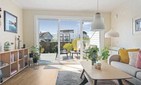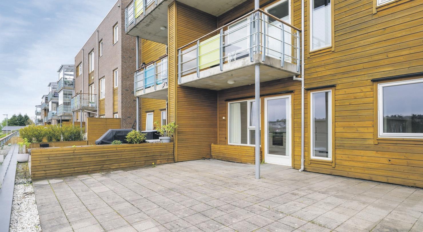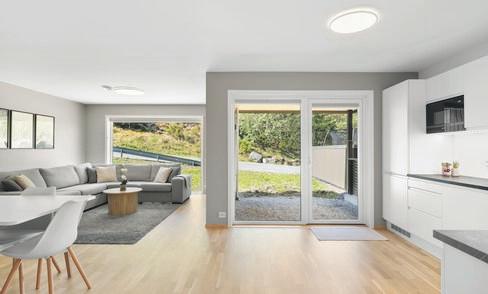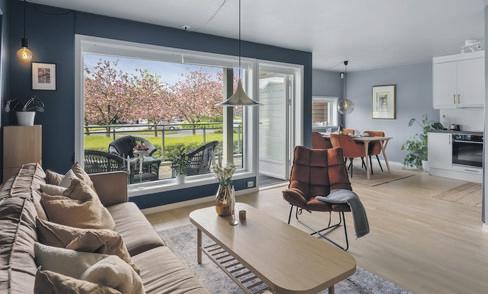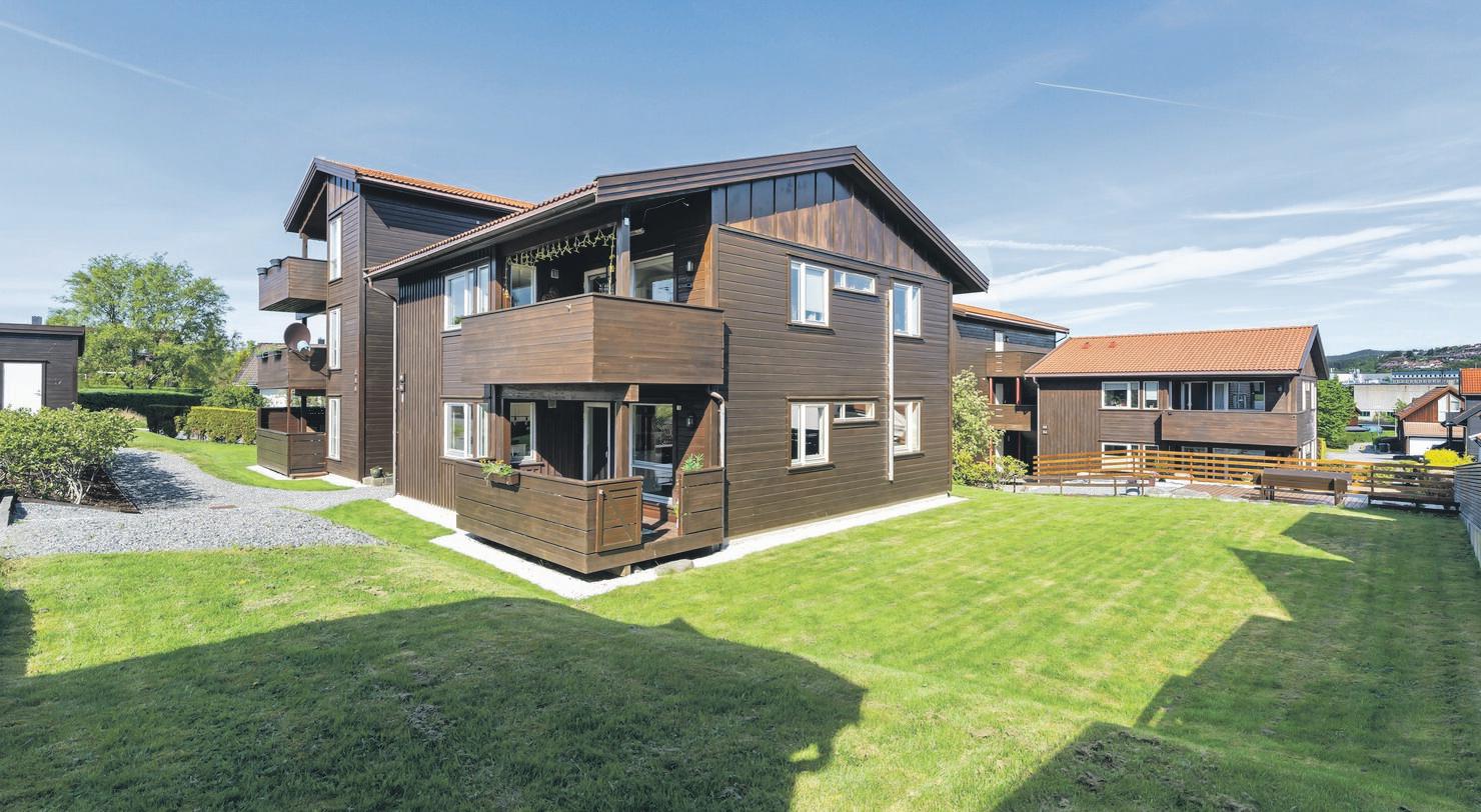 1. etasje hvor en kan gå direkte inn i leiligheten og direkte ut i den praktfulle hagen fra terrassen. Her får du eneboligfølelsen - Stor, lun, sørvendt og delvis overbygget terrasse. Denne er virkelig en ypperlig forlengelse av leiligheten - Det er også en herlig terrasse ved inngangsparti med morgen - og formiddagssol. - Denne leiligheten har alt på ett plan (ingen trinn ned i stuen)