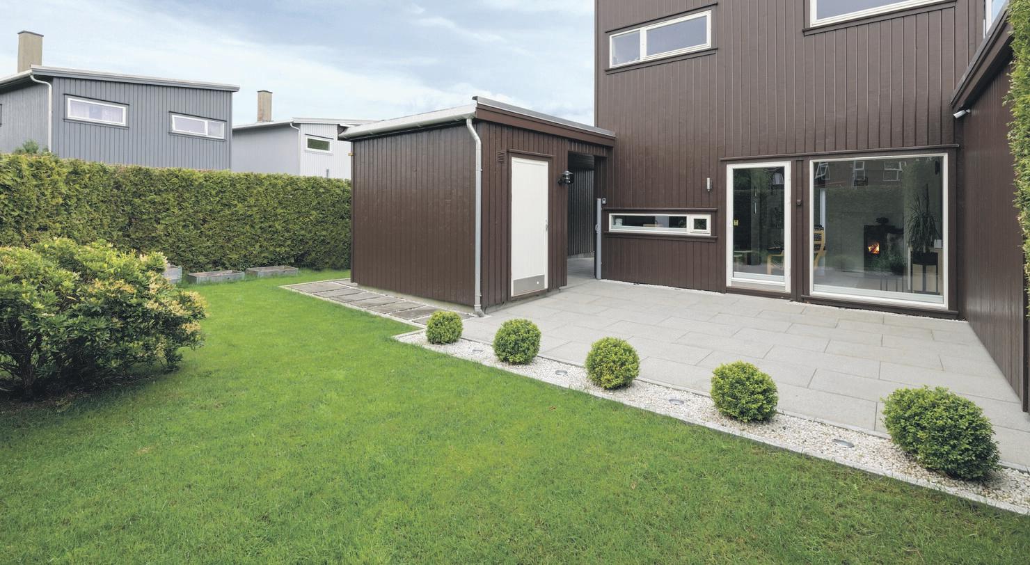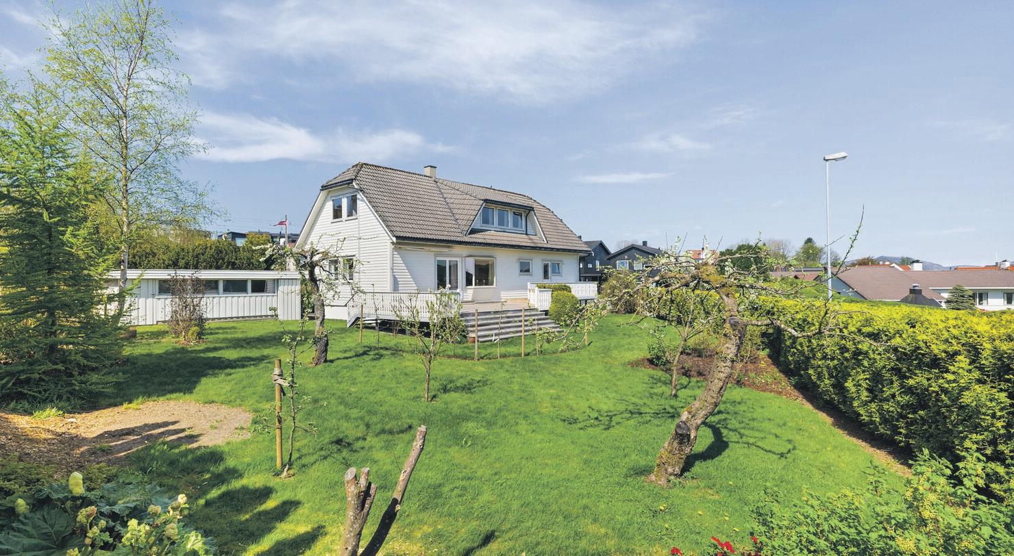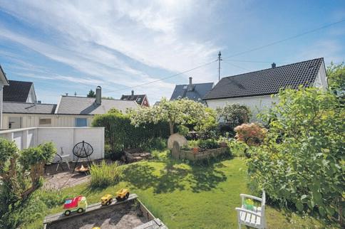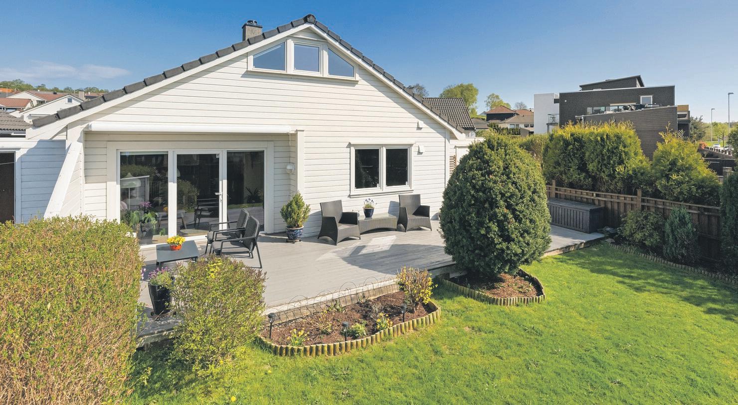 legger vi til det staselige treet som passer på huset, den bittelille bakken som skaper nivå og akemuligheter, og den lune plattingen, med sol til nærmere halv åtte en sommerkveld.