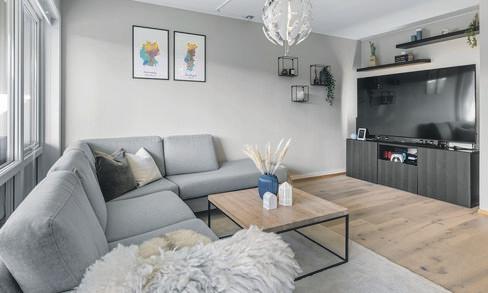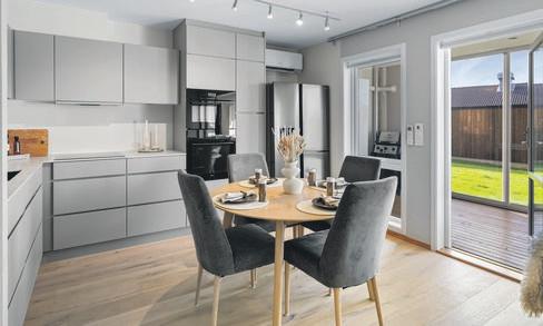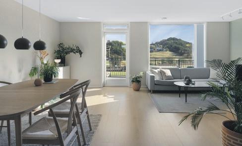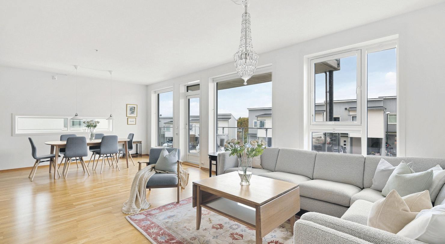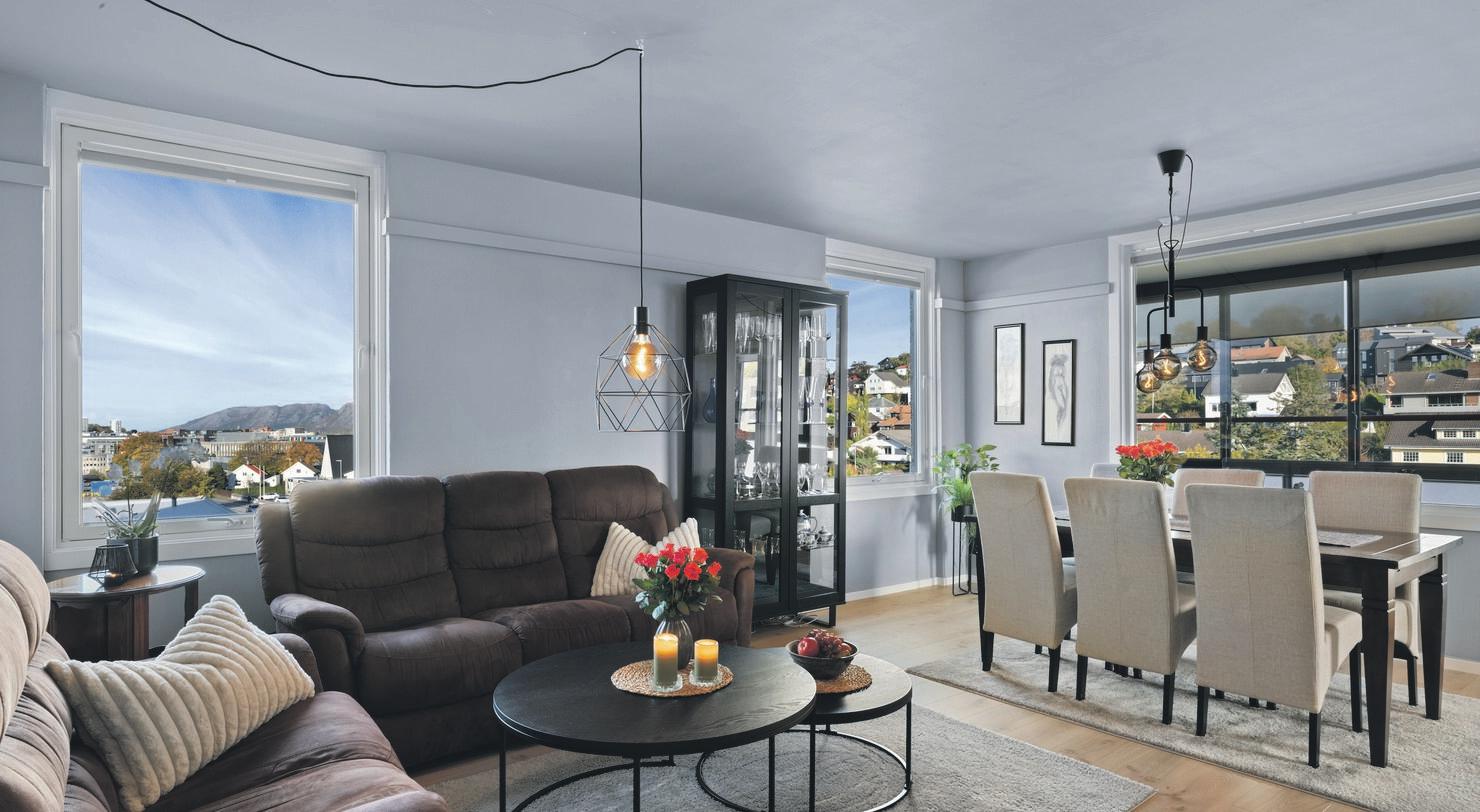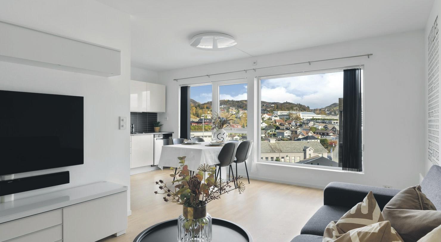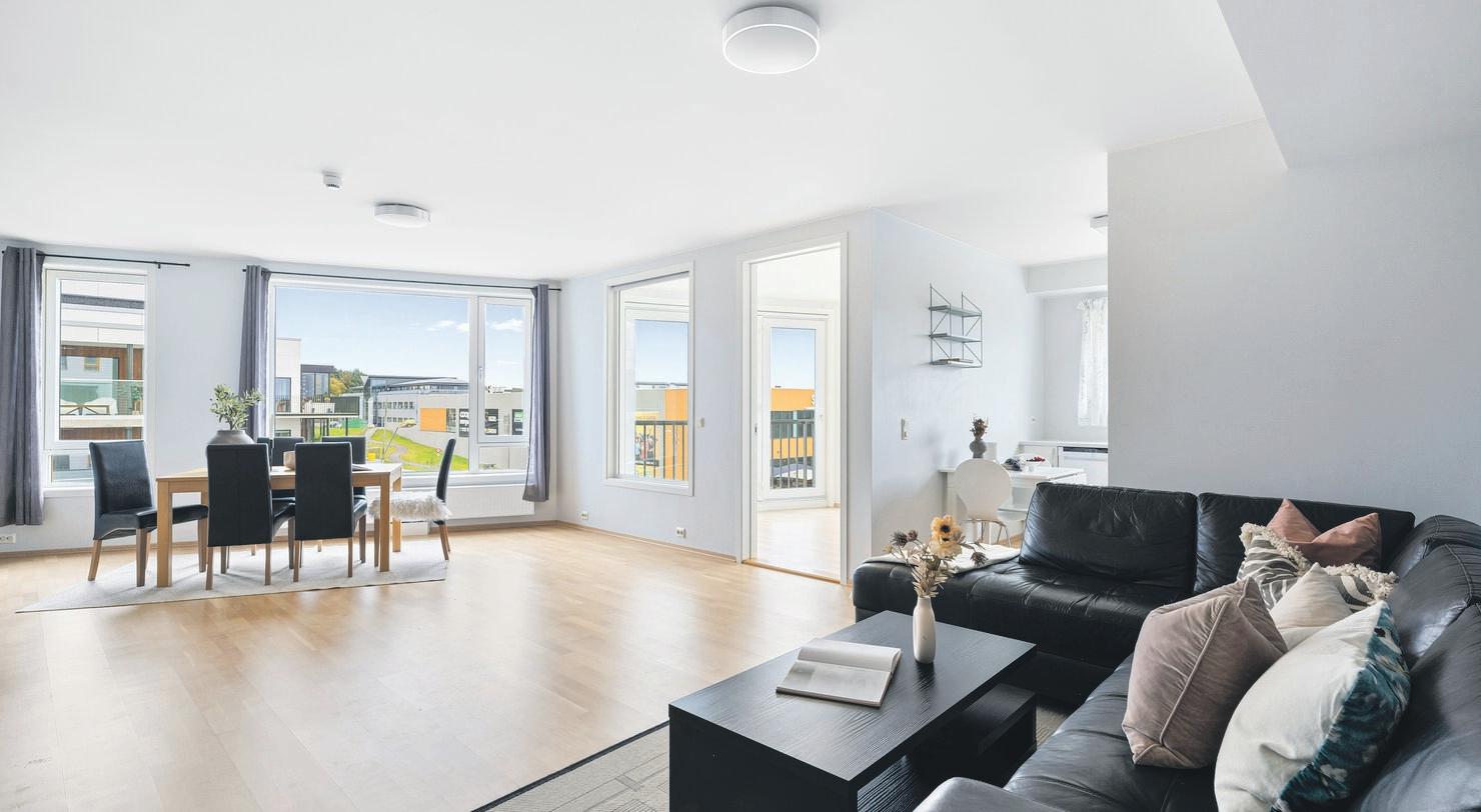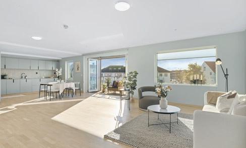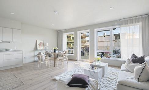 Innvendig har du alt du trenger, også i de minste leilighetene. Her får du to soverom og stue og kjøkken i åpen løsning med god plass til både spisestue og salong. De største leilighetene er nesten som