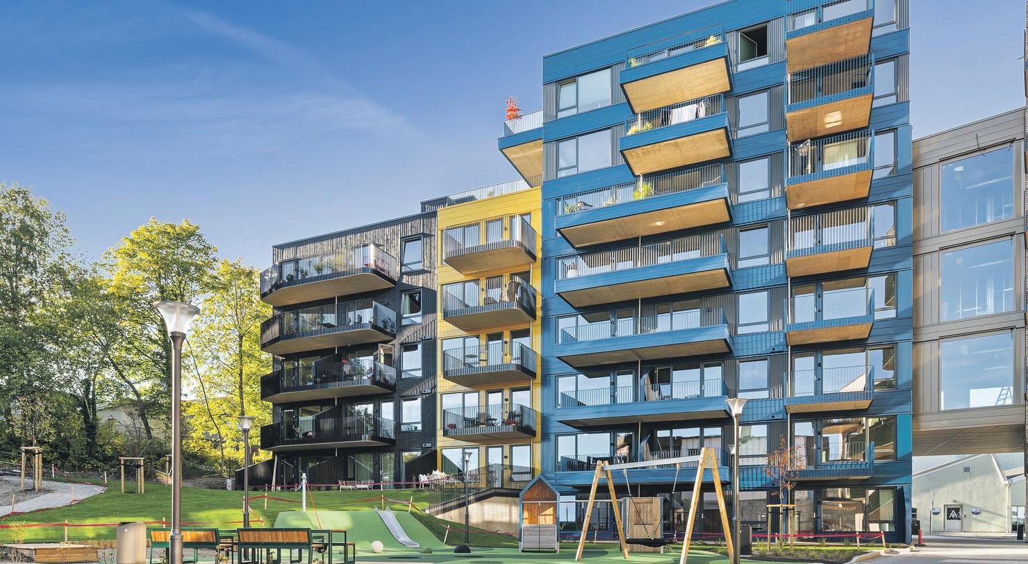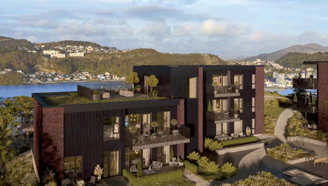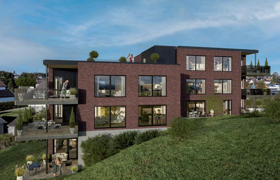 Utbygger Solon Eiendom og arkitekt Sjo Fasting har sammen utviklet et intimt lite nabolag med to lave bygg som er nennsomt plassert i forhold til hverandre, naturen og utsikten.