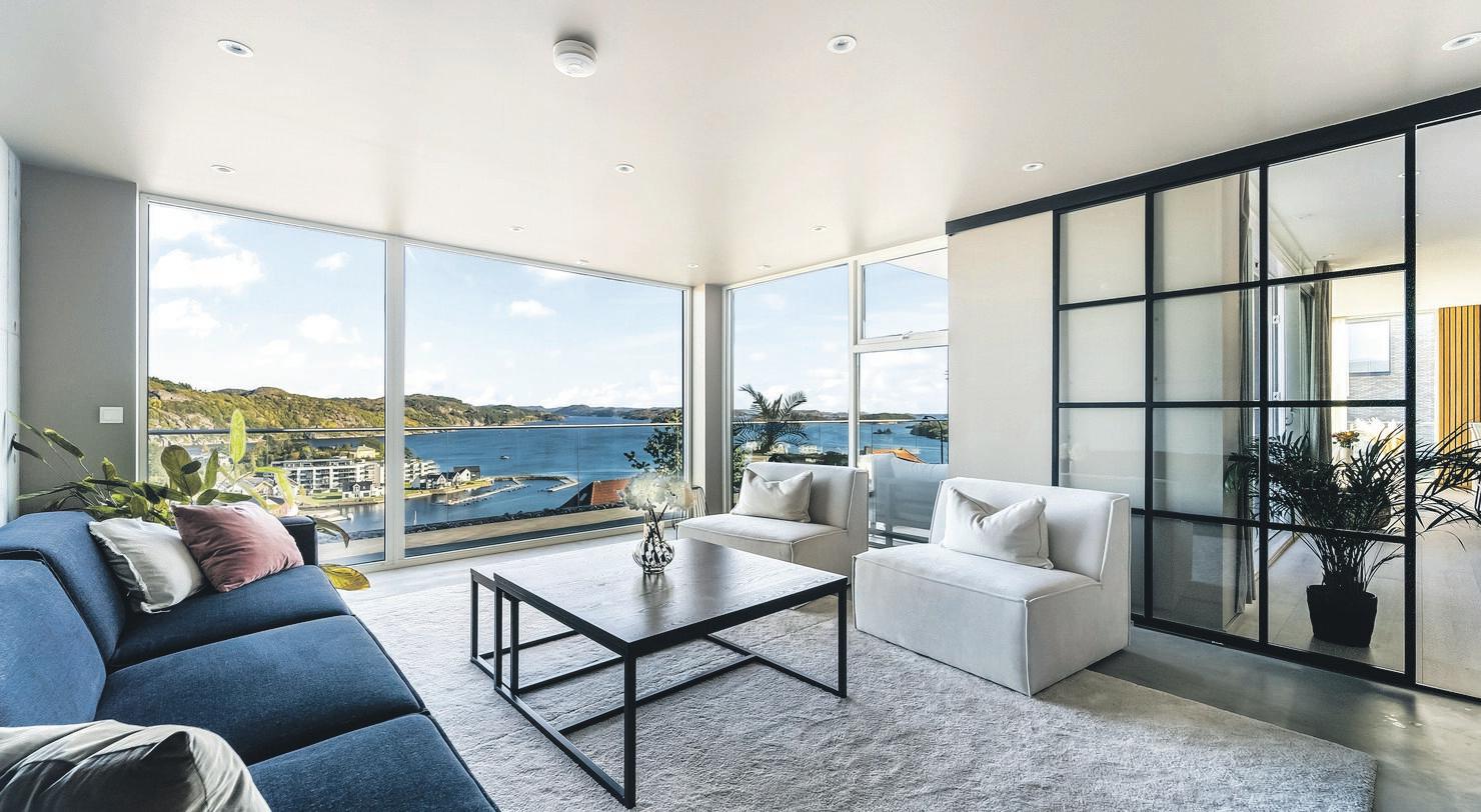 Moderne, lys og stilsikker toppleilighet med høy standard og utsikt til skjærgårdenDobbel garasje - GjesteanneksIngen boplikt i Farsund kommune p.t.